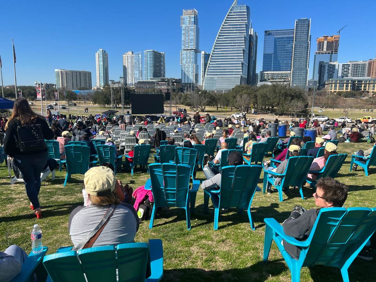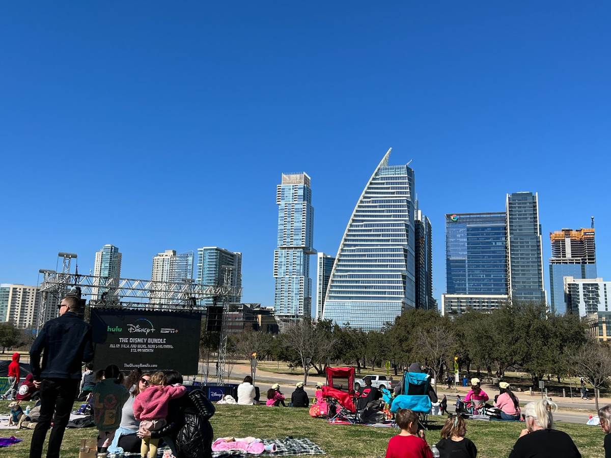 Using an LED screen, movies were easy to see during the day, with picturesque views of the Austin skyline in the distance. Families could spread out on blankets on the lawn and in the case of Cruella, quite a few attendees brought their dogs.