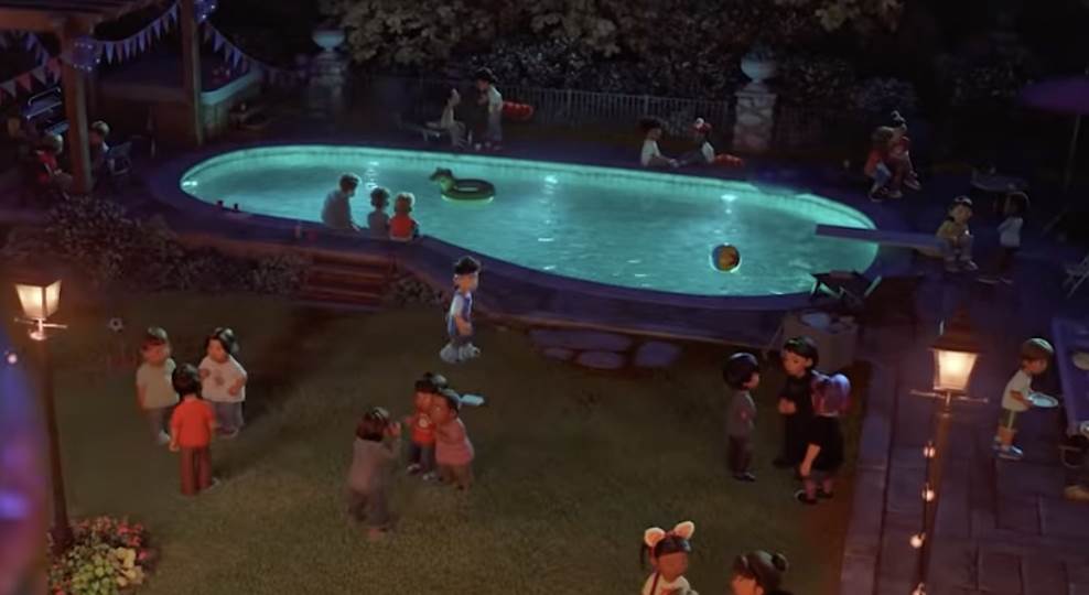 Speaking of Tyler’s party, that’s where you’ll find another of the recurring Pixar easter eggs. Dating back to the short, Luxo Jr. (which gave the studio their iconic lamp logo), the ball that is popped in that short has also appeared in feature films for decades since Toy Story hit theaters in 1995. The ball can be seen floating in the pool during the party.