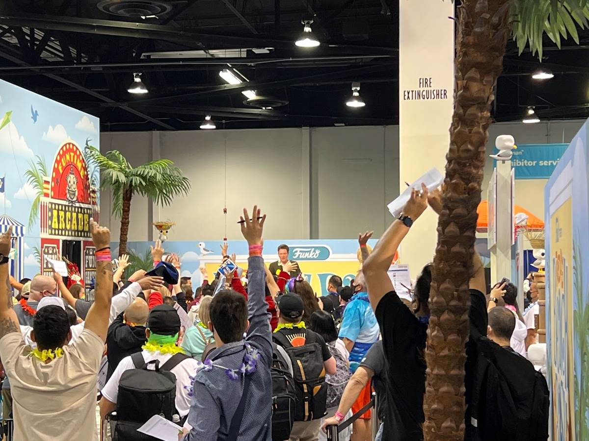 While attendees wait in line to check out with some event releases, there’s a DJ offering giveaways throughout the beach bash. Funko founder Mike Becker was on hand to participate in the festivities.