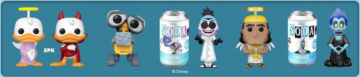 Of the Disney-branded items, there’s a Donald Duck two-pack of the angel and devil that often appear on his shoulders, a WALL-E figure proudly holding a cube of compacted trash, Kronk as an angel, and two Funko Soda releases - Scientist Yzma from The Emperor’s New Groove and Hades from Hercules.