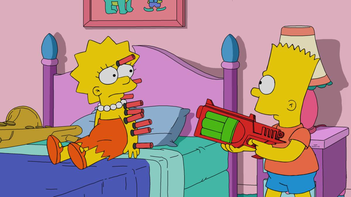 “The Sound of Bleeding Gums” begins with a flashback to the first-season episode “Moaning Lisa,” with Lisa playing the sax with Bleeding Gums Murphy on the bridge. In the present, the family (except Homer) watches an ad for a new streaming service called “Everything+” that features cartoons with all objectionable content edited out “so they’re four seconds long.” The next commercial is for the lottery and uses a Bleeding Gums song with changed lyrics, which naturally upsets Lisa. “He never would’ve sung this garbage,” she says. In the commercial, an actor plays Bleeding Gums hawking the lottery, and Lisa plays her family members the original version of the song, which is much more dour. “I can’t believe they’re using a jazz legend to sell lottery tickets.” Bart says the lottery is his retirement plan, but Lisa says it’s a scam to “trick poor dopes into buying tickets they can’t afford.”