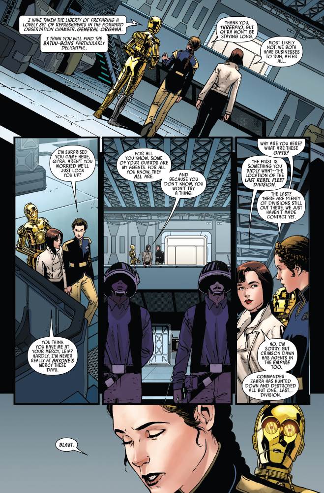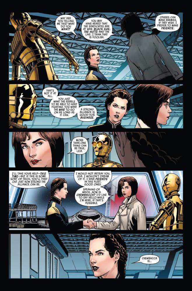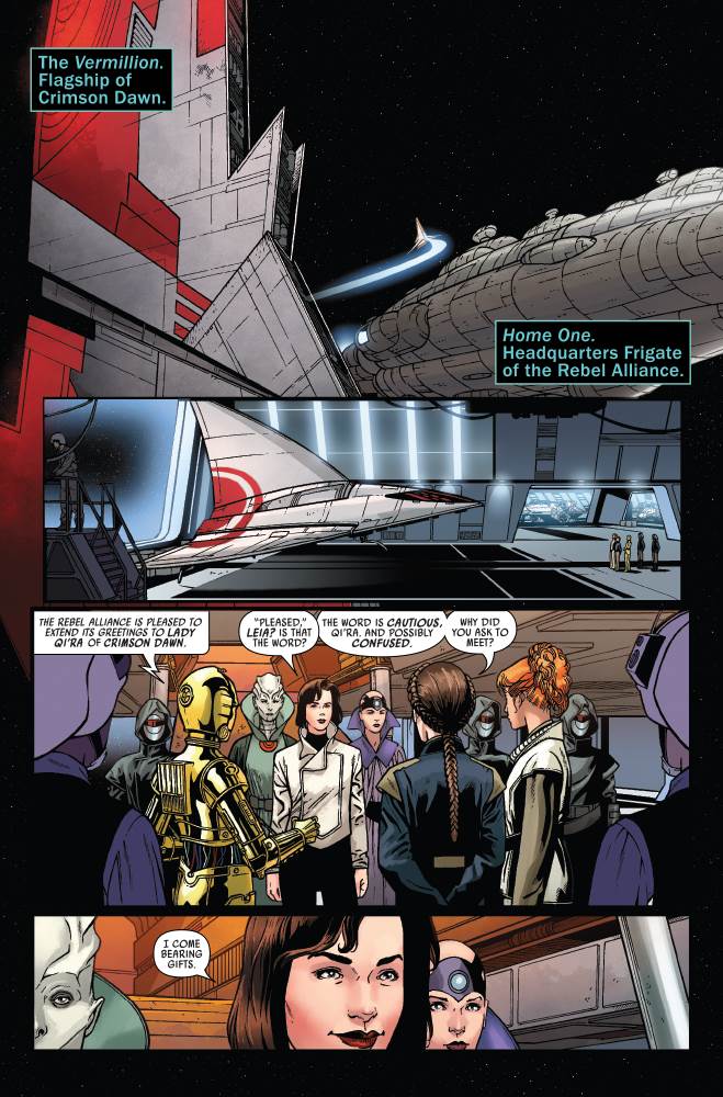 Just four issues ago in Marvel’s main Star Wars comic book title, Princess Leia Organa and Han Solo’s ex-girlfriend (not to mention current leader of the Crimson Dawn crime syndicate) Qi’ra met face-to-face for the first time. Now, in Star Wars #22, Qi’ra shows up aboard the rebel flagship Home One to strike a deal with the Alliance leader.