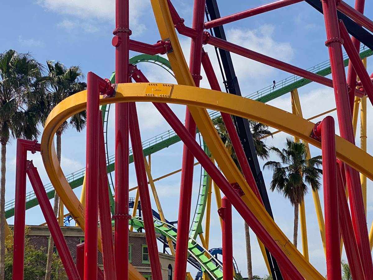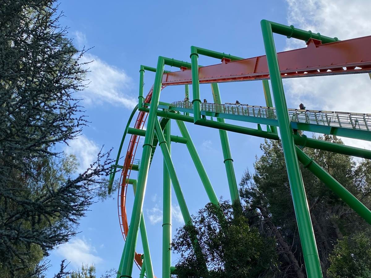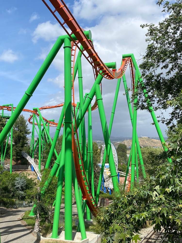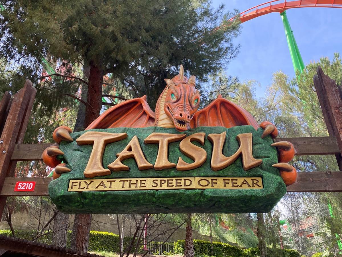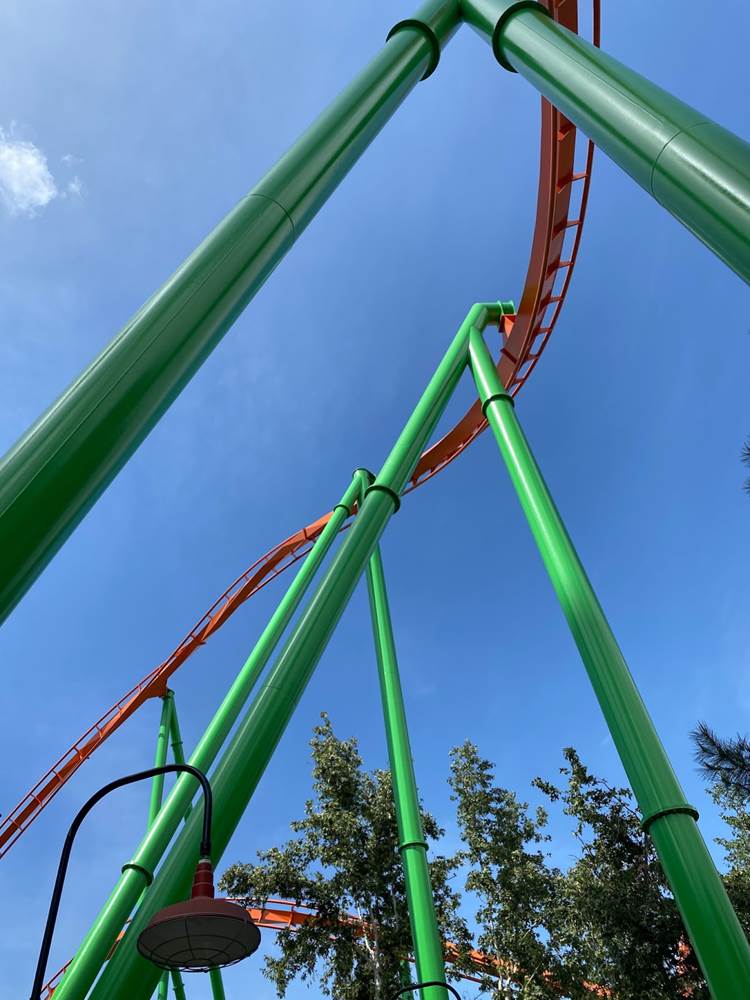 Tatsu, the park’s flying coaster, has reopened with a vibrant new color scheme in bright green and orange, very reminiscent of Nickelodeon colors.