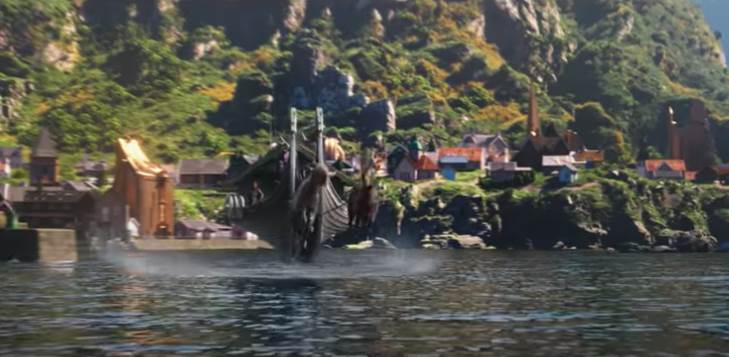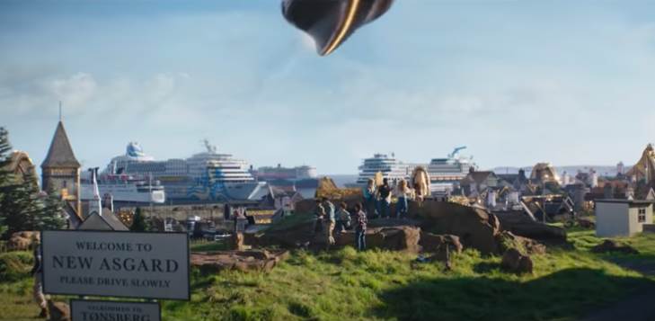 We get another look at New Asgard, which we first saw in Avengers: Endgame. The city appears to have become a tourist destination as we can see cruise ships in the distance.