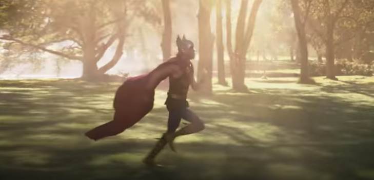 The teaser opens up with a young Thor running through the woods. As he passed some trees, we get a time jump and seen an older Thor, now appearing as a young man (god?) and sporting his classic comic-accurate costume. Finally, one more jump shows us a more familiar MCU version of the character.