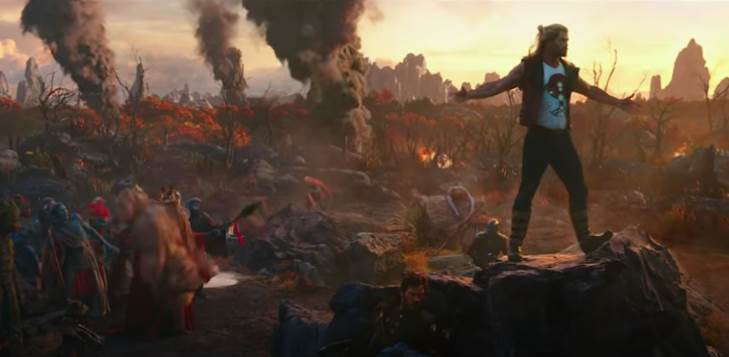 Thor holds true to his talk of remaining peaceful though as, on what looks like the same planet from the previous shot, the Guardians run into an apparent battle while Thor stands behind and eventually walks away.
