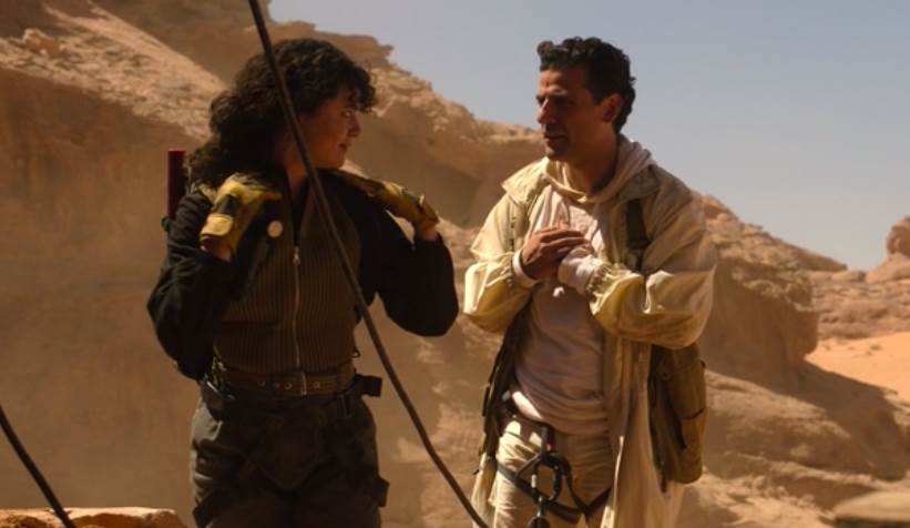 We get a glimpse of some sort of sharp tool, covered in blood, in the sand, foreshadowing something ominous waiting for the pair inside the tomb. They prepare to repel down into the tomb and Layla leans in for a kiss, but Steven interrupts her by telling her that Marc is trying to protect her from Khonshu. Layla makes it clear that she prefers Steven to Marc these days and he kisses her before she repels down into the tomb. As Steven looks down into the tomb, he suddenly punched himself in the face, clearly the actions of Marc.