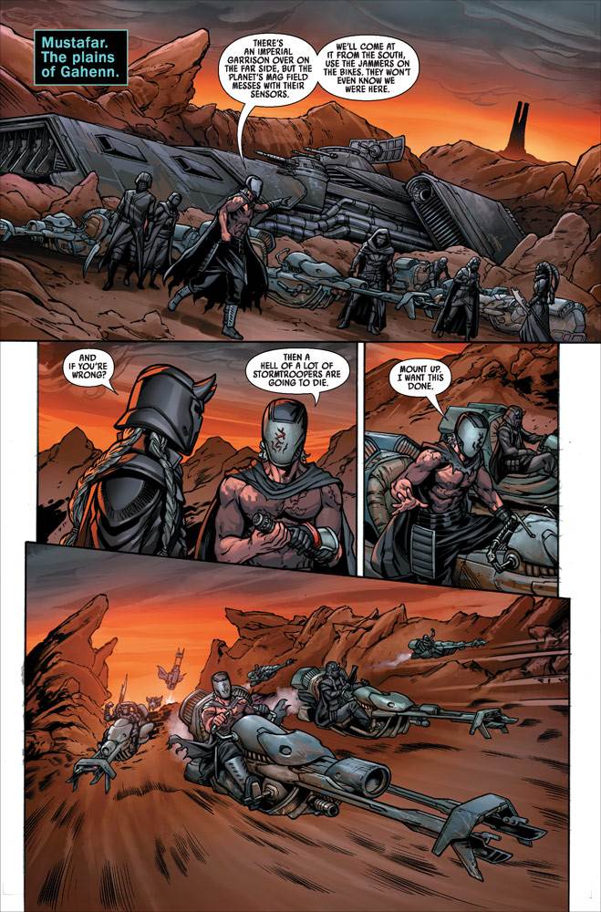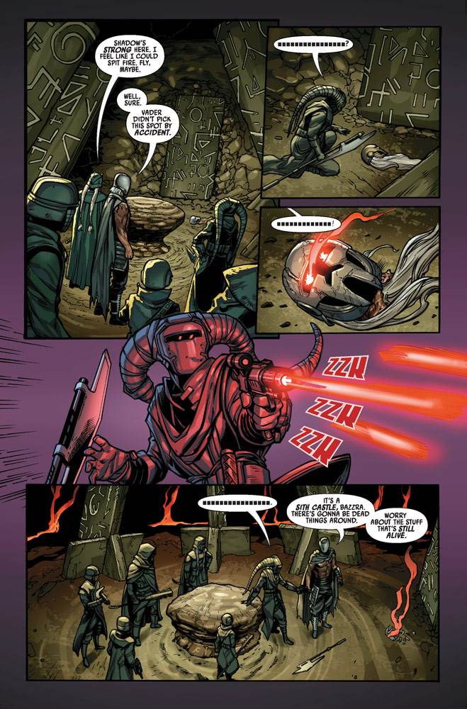 Indeed, Crimson Reign #4 focuses pretty much exclusively on the Knights of Ren, opening with a flashback to the planet of Varnak, where Crimson Dawn ruler Qi’ra approaches the Knight and their leader (called only “Ren”) to help them permanently evade their enemies in the Empire and the Sith Order who seek to destroy them. Qi’ra sends the Knights to Darth Vader’s Castle on Mustafar (first seen in Rogue One: A Star Wars Story, but then expanded upon in Charles Soule’s equally excellent Star Wars: Darth Vader - Dark Lord of the Sith comic run) to steal a mysterious ancient artifact known as the Screaming Key. On their way to the lava planet where Obi-Wan Kenobi and Vader once famously had their no-holds-barred duel, the Knights of Ren are fairly confident that they’re going to have an easy time completing this task, but things get significantly more complicated for them soon after their arrival. In the castle, the Knights encounter a hauntingly familiar helmet, the enigmatic caretaker named Vaneé (also from Rogue One), and a whole mess of specialty trooper guards.
