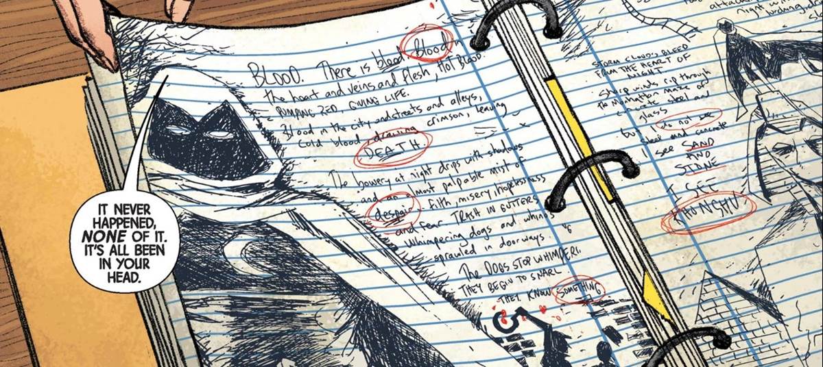Jeff Lemire’s “Moon Knight” run really flipped the character on his head when he tried to tell us that none of his life, which fans had been reading about for decades, actually happened. Marc wakes up in an asylum and in this panel, a doctor tells him “it’s all been in your head.”