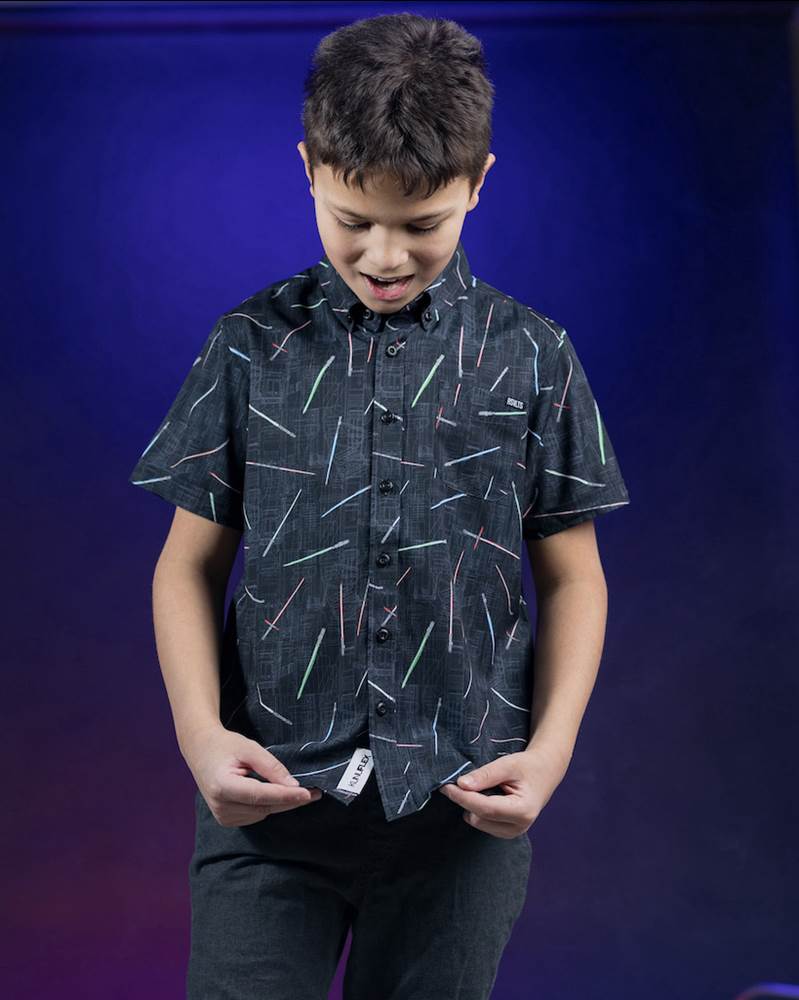Ah the lightsaber. A powerful and useful tool in the right hands. A deadly weapon in the wrong hands. This pattern highlights a few of the most famous ever wielded by the likes of Kylo Ren, Count Dooku and even Darth Vader. Available in traditional and youth button downs, and hybrid swim.