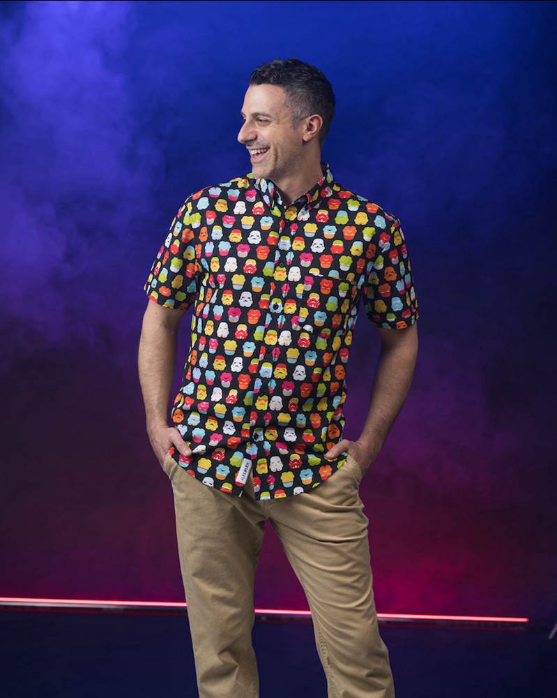 Regardless of their aim, Stormtroopers just look awesome. Even more so when they are decked out in bright colors! This brilliant pattern features a variety of Stormtrooper helmets in bold hues and lets just say… They understood the assignment. Available in traditional and youth button downs, hybrid swim and koozies.