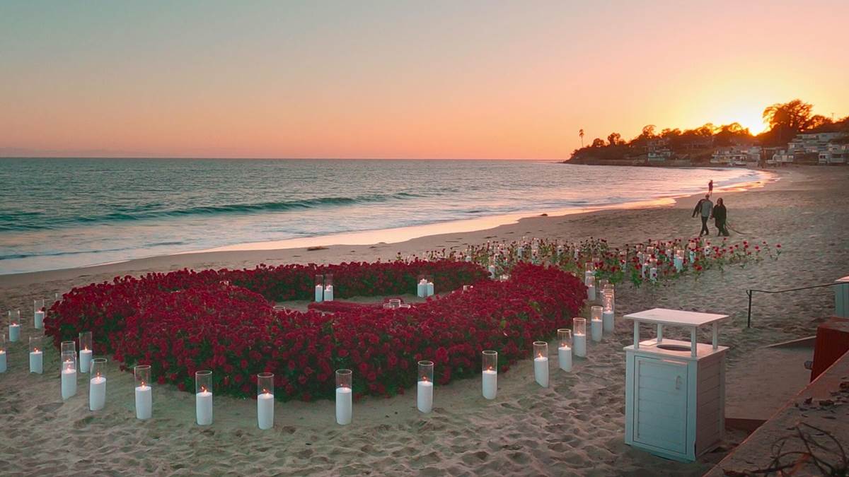 And suddenly, we’re on the beach with the couple of the hour. Kravis walks through the massive bed of roses, decked out in head-to-toe black and the monumental proposal occurs. It’s an intimate moment, caught on camera of the two PDA-machines taking the next step in their relationship. This is one of the first proposals I can remember where both parties were wearing sunnies.