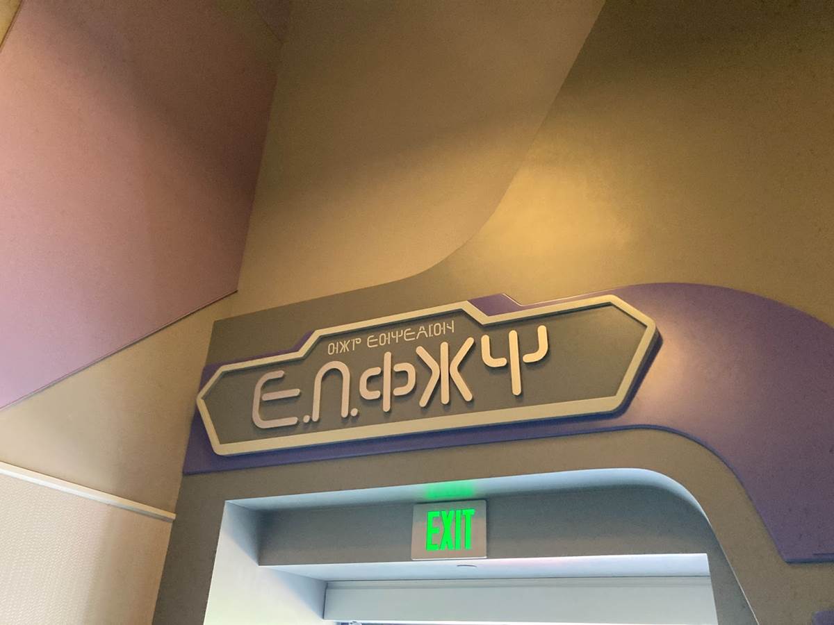 Looking back at that sign from the attraction’s exit, I noticed that top line started with a character that wasn’t included in the alphabet in this chart. I also noticed that character was featured a couple of other times in that same line. After some trial and error and a whole lot of flipping between photos, I was left with “-OW E-TERI-G EPCOT.” Feeling pretty confident that the top line didn’t say “MOW EMTERIMG,” I had unlocked the Xandarian alphabet and quickly got to work on other signs.