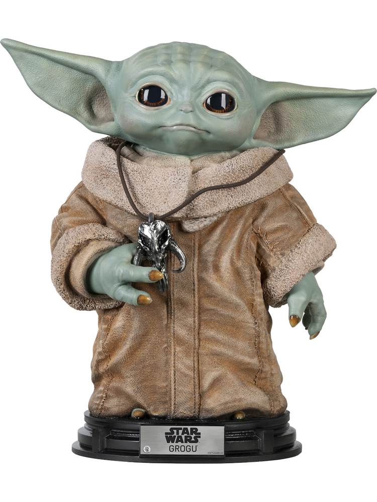 - Grogu is dressed in his signature fleece-lined robe, and wears a Mythosaur necklace with a medallion that he holds in his hand. The stunning piece also comes with a display base that has the character’s name engraved on it.