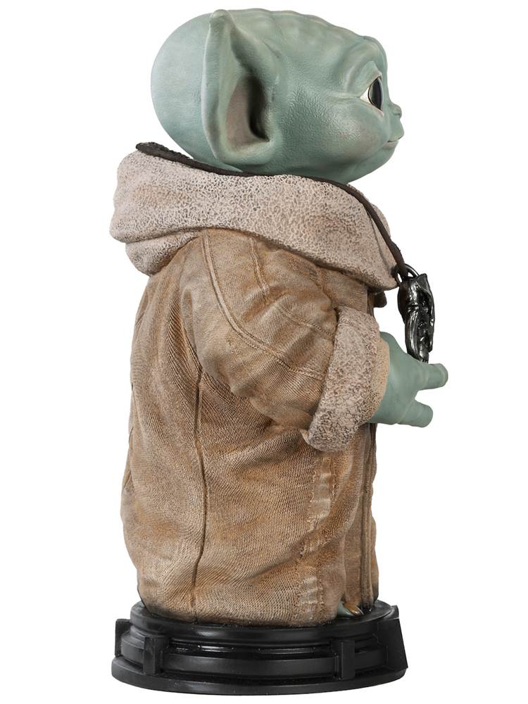 - Grogu is dressed in his signature fleece-lined robe, and wears a Mythosaur necklace with a medallion that he holds in his hand. The stunning piece also comes with a display base that has the character’s name engraved on it.