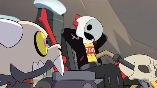 Elsewhere, King is pondering life when he comes across Steve the Coven Scout (From Lilith’s party), who also appears to be pondering life. He has a sidecar and nowhere to be. King jumps in and wherever he points, Steve drives. Though it's worth noting that Steve is reading a book called “Synergy in The Emperor’s Coven" as King finds himself. Lilith and Hooty are tracking them though, since earlier the noticed King ran away. Together, King and Steve share some moments in a montage, helping stranded witches and adoring witch couples. Steve rips up portions of the book and even makes King a little paper doll. Eventually, Lilith and Hooty catch up to Steve and King and are immediately wary of his intentions, but it seems okay. Steve has taken off his mask and it seems that he has given up his position as a coven guard. King also cracks and tells Lilith to stop acting so weird around him, he’s still just King.