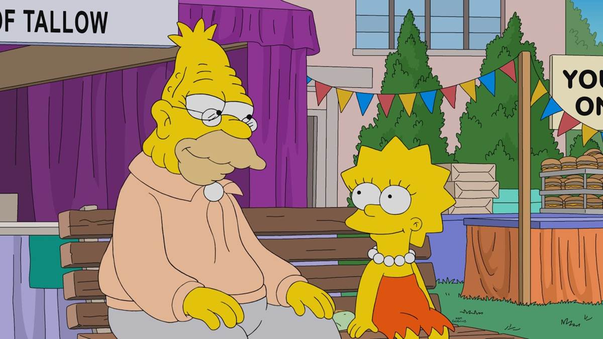 In the present, Gus tells Abe he is now on his board of directors, but Grampa is worried he’s going to blow the opportunity because of the Simpson curse. He asks Lisa to come with him to New York because he couldn’t do it without their special bond. They hop on Gus’s helicopter and he sings a parody of “Pure Imagination" from Willy Wonka and the Chocolate Factory. Lisa is disgusted by Gus’s wealth, but Gus introduces her and Abe to his family anyway. All the family members have their own various issues a la Succession, and inside their mansion Gus has preserved his old burger stand, where he and Abe immediately start flipping burgers again. Lisa rides horses through virtual scenery with Gus’s daughter Sheila, who tells her that Gus has gone soft because of his happiness at being reunited with Abe. Sheila says she wants to rebrand the family business into a more eco-friendly corporation.