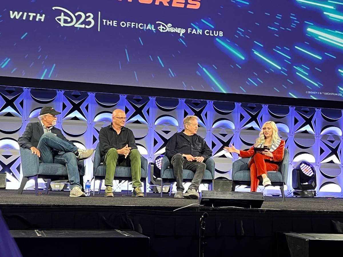 Tony Baxter, Chris Runco, and Dennis Muren joined Ashley on stage to talk about the original attraction. Tony and Dennis revealed that they actually met at a party before Star Wars was released in 1977. Tony recalled the party having lots of props and costumes of weird aliens, with guests at the party trying them on. Dennis revealed that these were from the Cantina scene, some of which was filmed in L.A.
