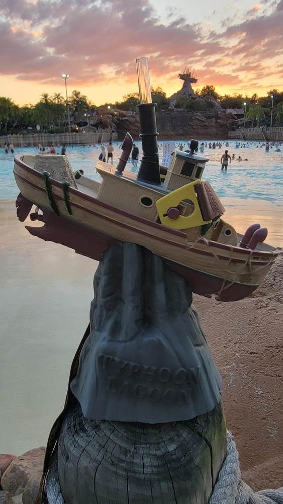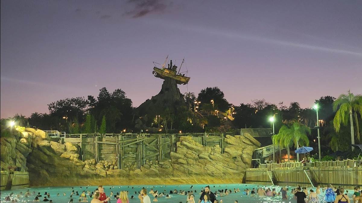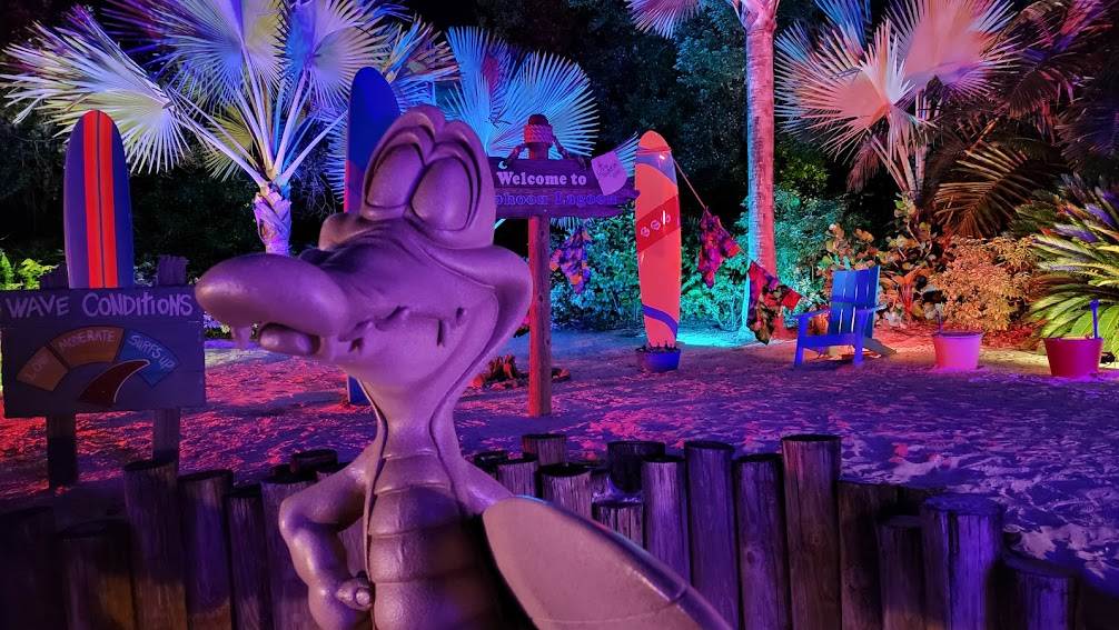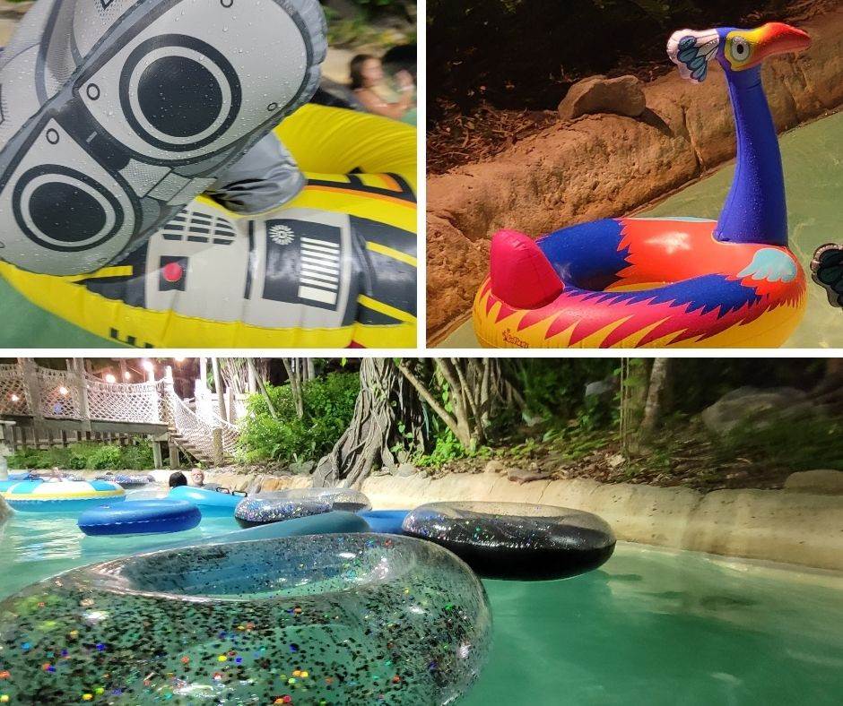 Watching the sun set behind Miss Tilly and the lights flood Typhoon Lagoon’s Surf pool was as beautiful as I’d hoped. While all the water slides were open, only Castaway Creek had a special component (other than an under the stars experience). Throughout the lazy river were confetti sprinkled inner tubes as well as character tubes such as Wall-E, Up’s Kevin, Stitch and more.