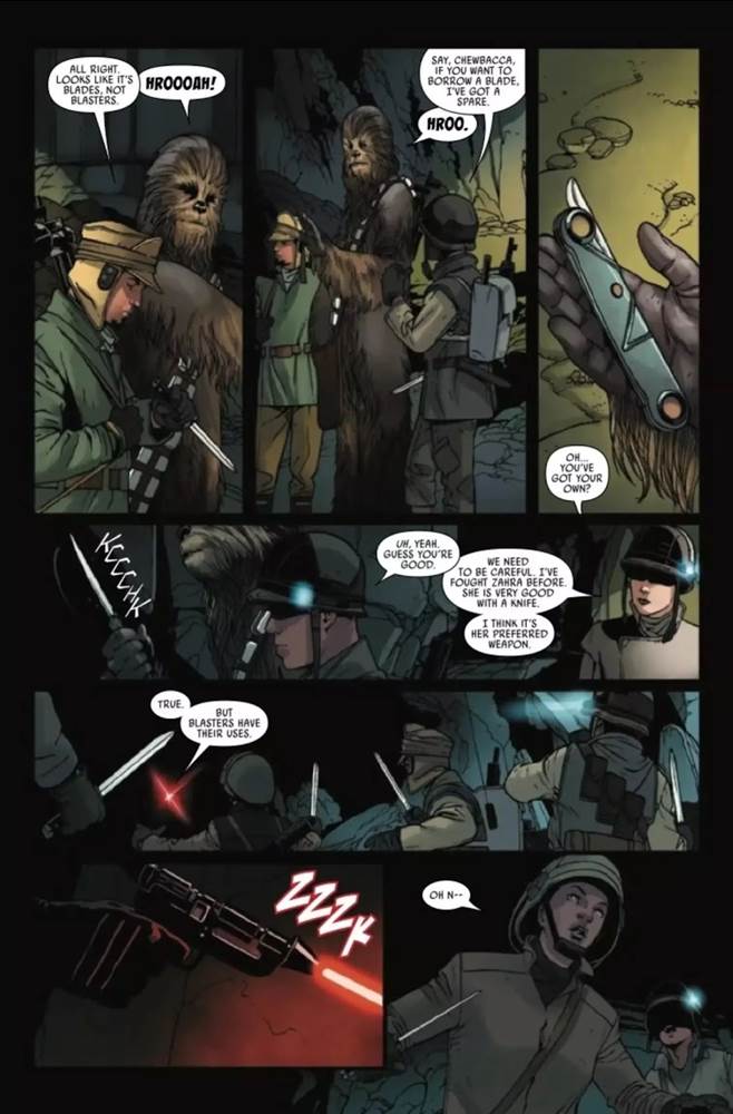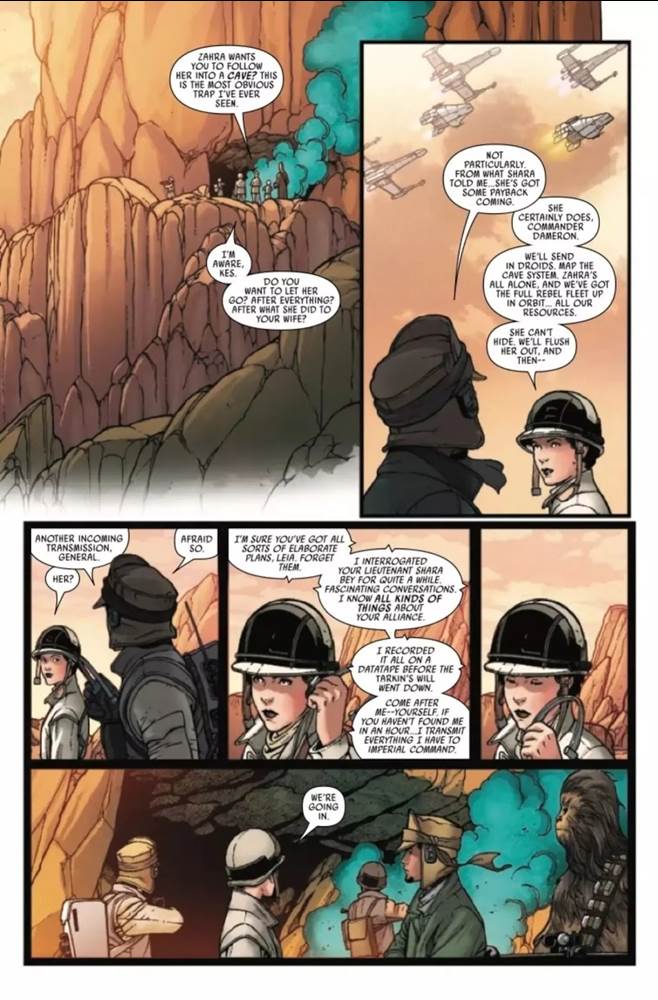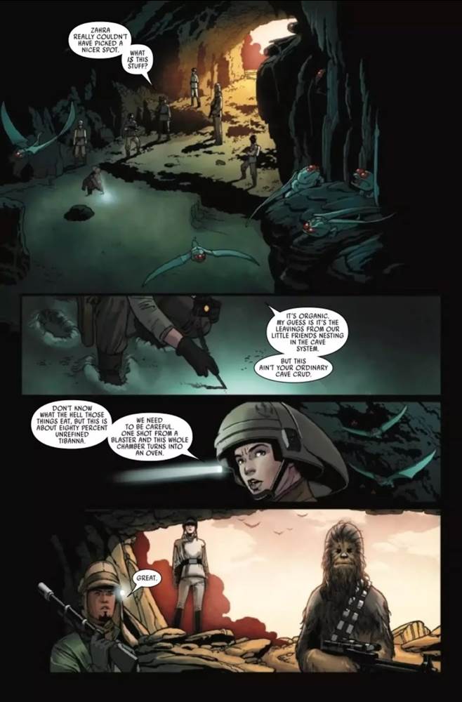 Regardless of all that, today’s issue #24 of the second current-canon volume of Star Wars begins where last month’s issue left off: with Leia’s rebel fleet having downed Zahra’s star destroyer the Tarkin’s Will on the planet Panisia. Mourning the loss of so many lives in the preceding battle, Leia declares Zahra the target of an all-out manhunt on Panisia’s surface, with Chewbacca, Kes Dameron, and Shara Bey’s Starlight Squadron all pitching in on the search. Zahra is ready for the confrontation, however, having ensconced herself in a dimly lit cave filled with flammable tibanna bat-droppings. A few more casualties later, the Alliance gang corners Zahra in the cave and a battle ensues, with our two leads on either side plummeting into an underground lake below. From there, Leia and Zahra must briefly form an uneasy alliance to fend off the cave’s vicious, glow-in-the-dark wildlife until they find themselves with nothing to fight but each other.
