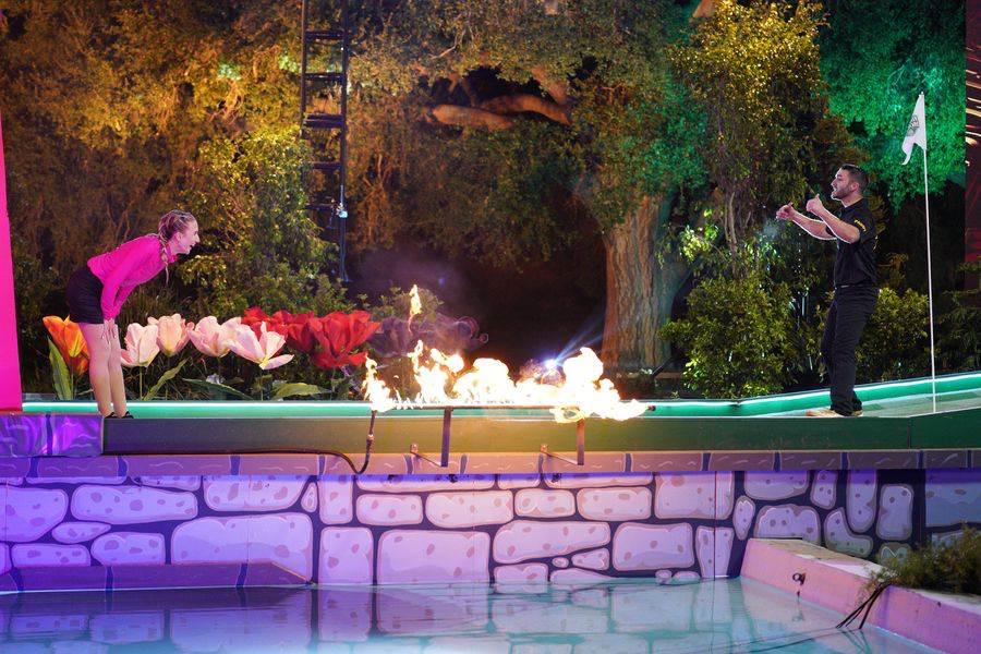 Now, on to tonight’s first hole, the iconic Dutch Courage en Fuego, a hole that has been around on all four seasons of the show in some form or another. Tonight, Ashley challenges pro stunt-man Paddy B. She puts a little too much gas into her putt and misses the hole, and while running through the spinning blades of the windmill, gets brutally knocked off the platform and into the pool below.
