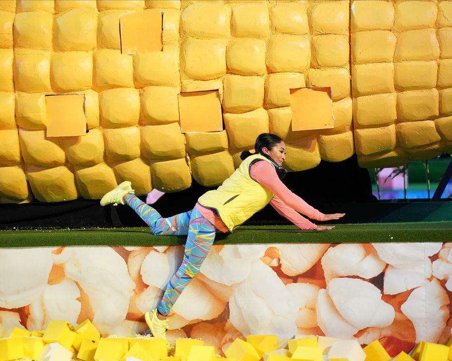 Round 2 continues at Corn Hole, where Kate and Maggie battle to find out who makes it to the finals themselves. Kate’s putt gets her onto the green but she moves very slowly during her run along the corn, and finds herself exploding into the pit of kernels below. Maggie’s putt was also very good, but her run however, was not. During her sprint, she lost her footing and found herself in the kernel pit well before the corn even had a chance to explode. Thankfully, her putting made up for it, and Maggie found herself winning the hole and moving on the final round.