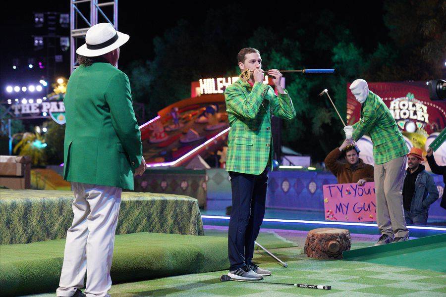 Every contestant tonight is a musician in some way, so tonight is the “Night of Music" on Holey Moley: Fore-Ever! And the first hole we see is PoleCano. Michael takes on Nick on this hole, and Nick is a rapper. So get ready for some rapping from Rob, pending he can get his breathing in control. For the first time on the series, both players managed to get their ball in the tiki channel, both landing beautiful tee shots. They both also secure their landing on the pole after being rapid-fired into it, and it is decided that they need to upgrade the hole with live animals in the water, barbed wire on the pole and maybe some electric shocks. Hate to say it, but I kind of agree. Over on the green, Nick misses his putt but Michael makes his and wins the hole.