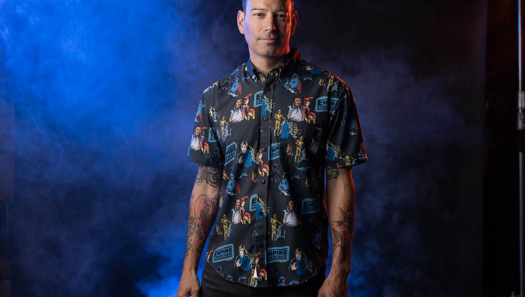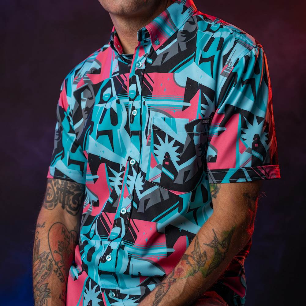 Cue the nostalgia! Star Wars fans of a certain age will immediately recognize this design as the VHS cover of Return of the Jedi. Here Yoda gives a sagely smile knowing that there’s hope for the Rebellion after all. Meanwhile Luke and Vader battle it out with lightsabers before the Emperor. Ahh! We love it! The print is available in traditional Kunuflex button downs.