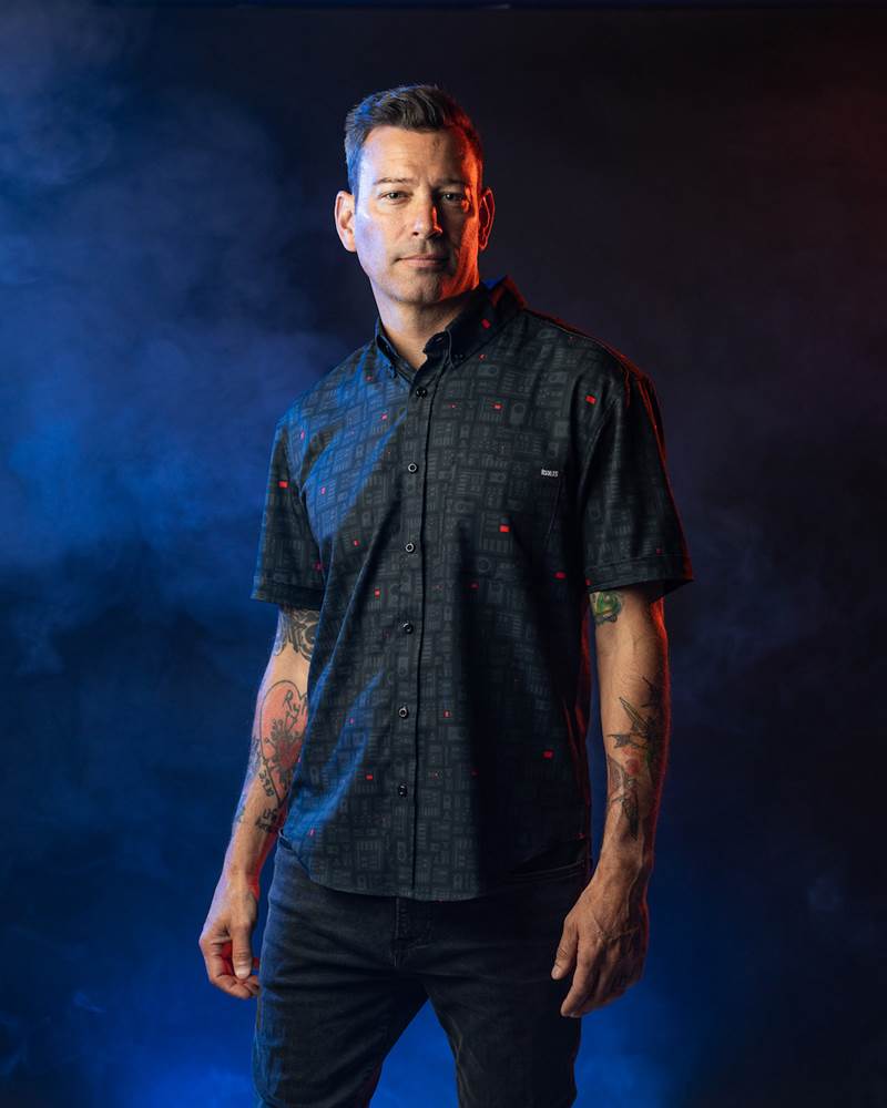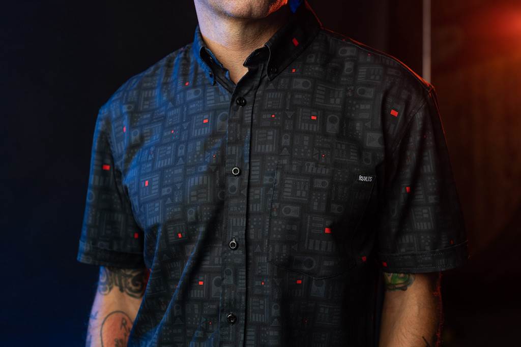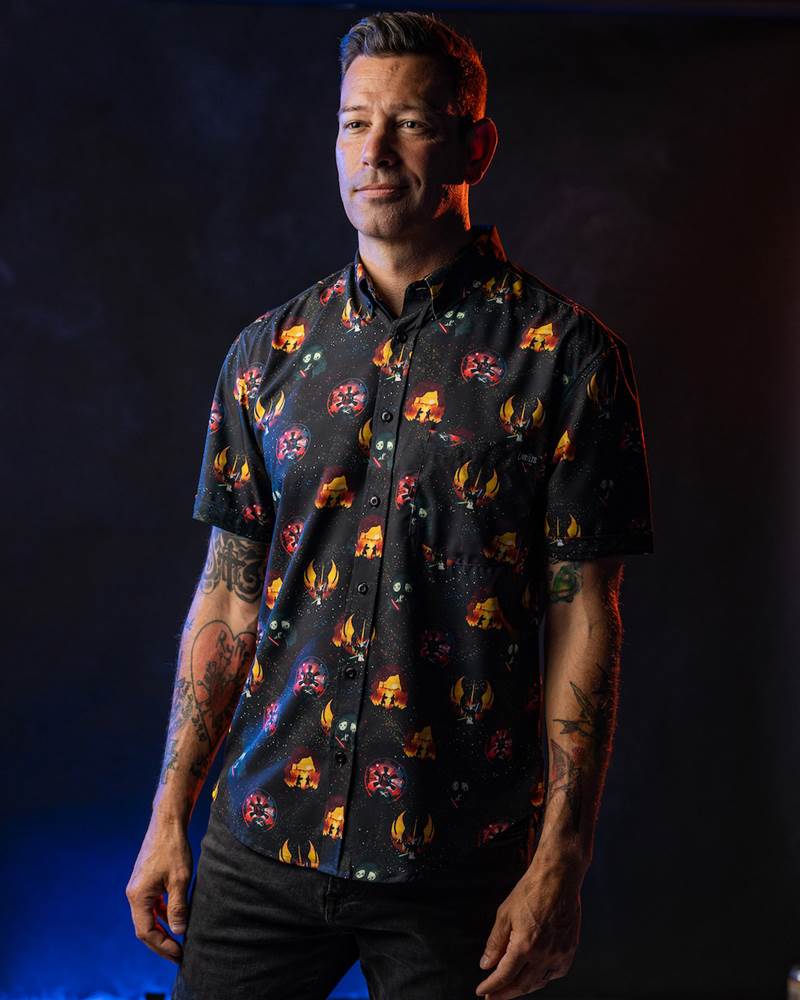 Darth Vader is menacing and driven and has one of the scariest looks in all of science fiction. This shirt offers a dark pattern with small icons styled after Vader’s chest piece and breathing apparatus, complete with red lights and buttons for just a pop of color. Available in traditional Kunuflex button downs and koozies.