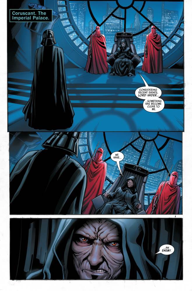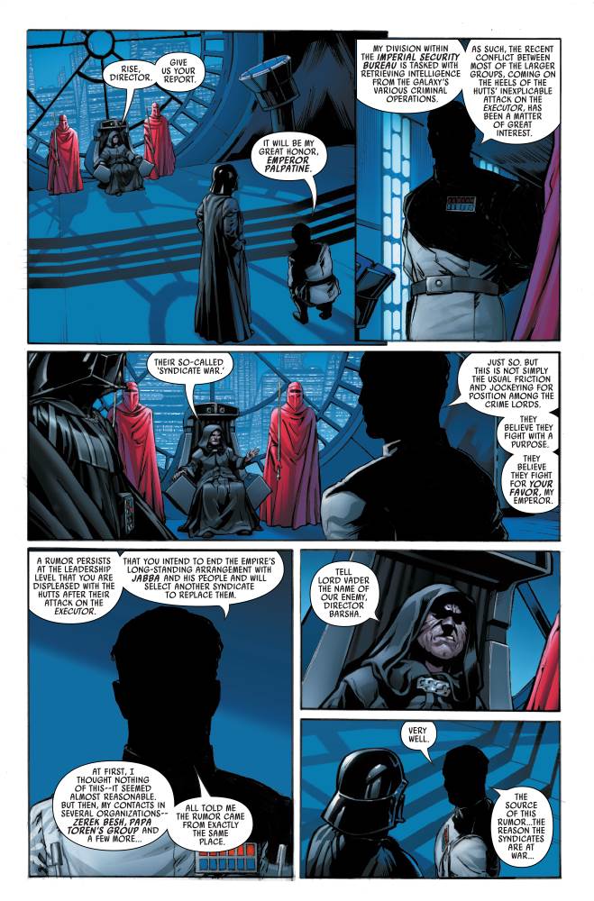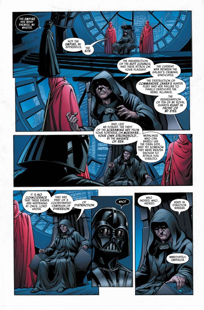 Crimson Reign #5 opens with Emperor Palpatine cluing Darth Vader in on who is actually behind many of the recent major events in this period set between The Empire Strikes Back and Return of the Jedi: the crime syndicate known as Crimson Dawn, with Han Solo’s ex-girlfriend Qi’ra acting as its leader after the death of Maul.