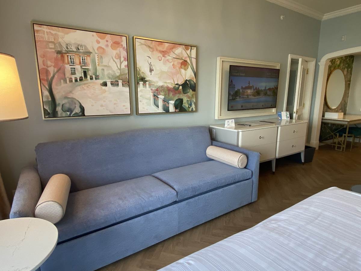 The new rooms take heavy inspiration from Mary Poppins, and though I feel it’s the original Mary Poppins, others touring the resort said it had more of a Mary Poppins Returns feel to it. You be the judge! Hidden details are peppered throughout, including a glass penguin found in the chandelier in each room. Two new art pieces show Mary Poppins herself flying down to Cherry Tree Lane, and are sure to be a hit with fans. However, there are no plans to sell the pieces (think the on-demand system at Disney’s Riviera Resort) at this time. Trust me, we asked. For more about the hidden details of these new rooms, check out the video below where we share a quick moment with Shawn from Walt Disney Imagineering.