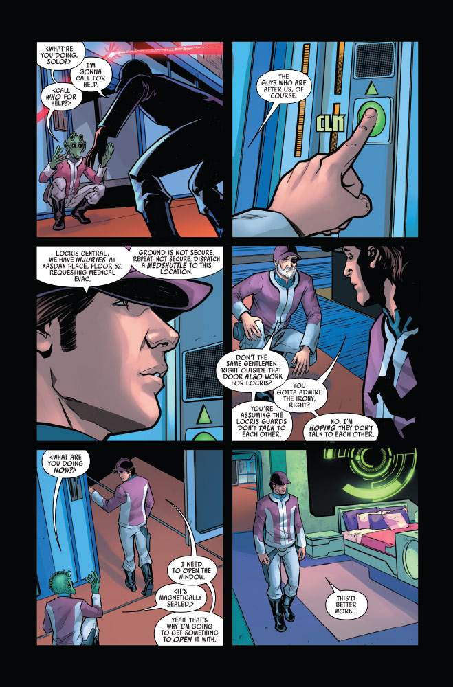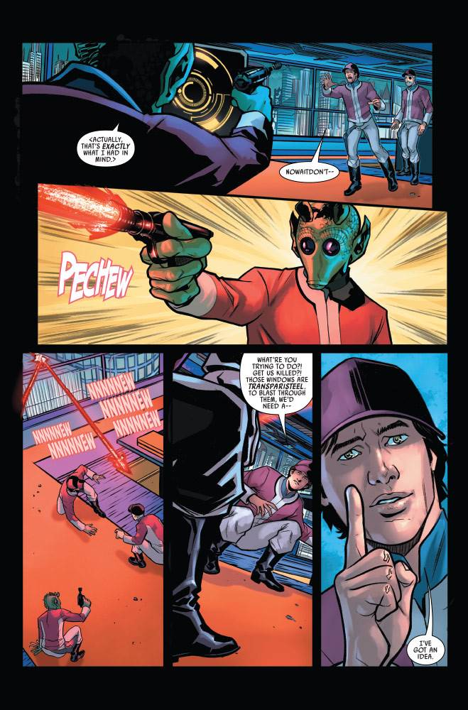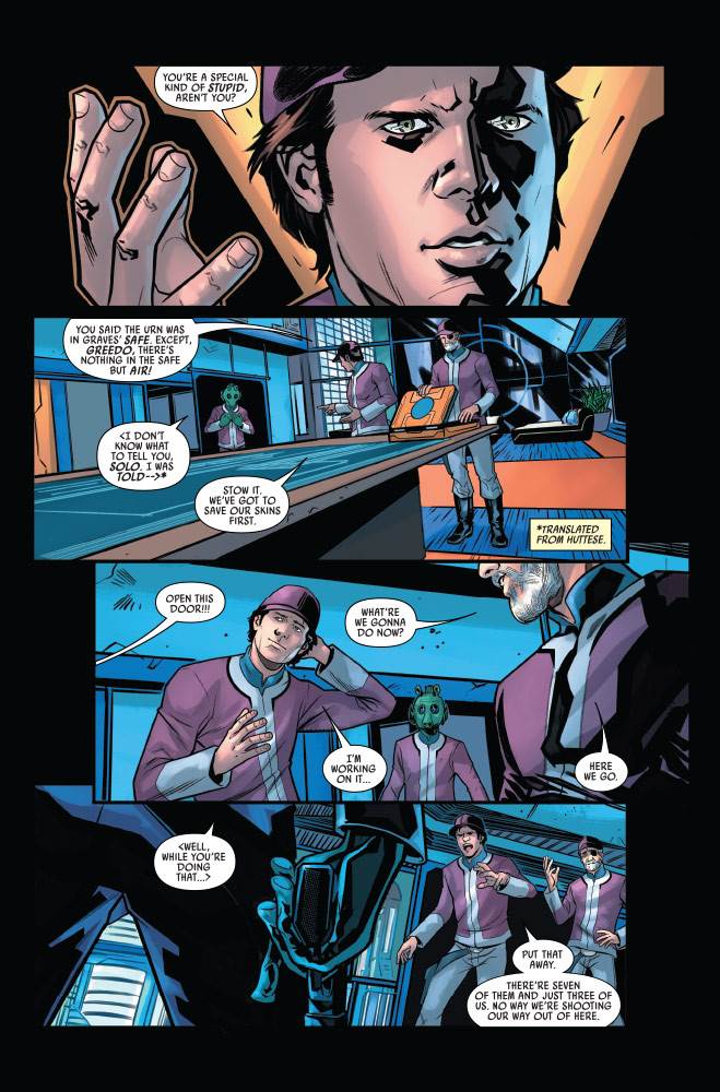 Han Solo & Chewbacca #3 begins where the previous issue’s cliffhanger ending left off: with Han, Greedo, and the man claiming to be Solo’s father cornered in a penthouse apartment on Corellia, their heist mission having gone astray when the item they were supposed to steal– namely an urn containing the ashes of Jabba the Hutt’s rival– turned out not to be in the safe where it was supposed to be.