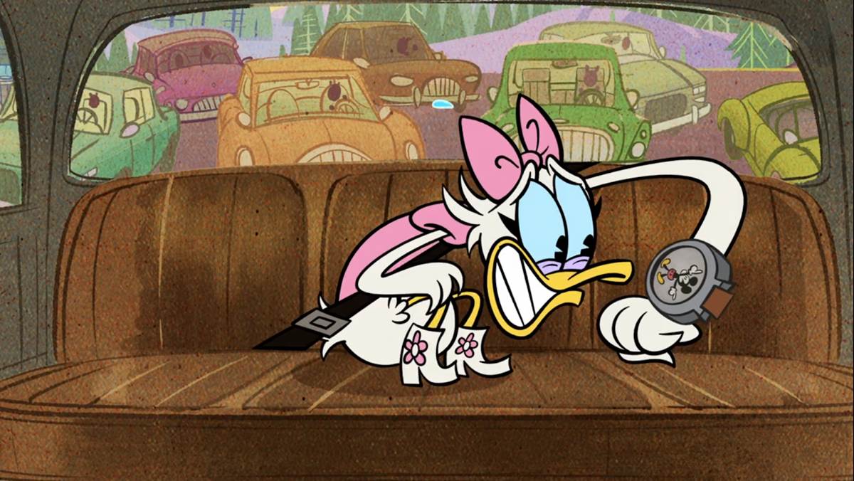 Frustrated, Daisy gets out of the taxi and proceeds on foot, running over cars. A convertible driven by Clarabelle Cow and Horace Horsecollar opens its top at the wrong moment, springing Daisy backward… all the way to her house! A luxury yacht sails by and Scrooge McDuck waves to Daisy, who asks for a ride.