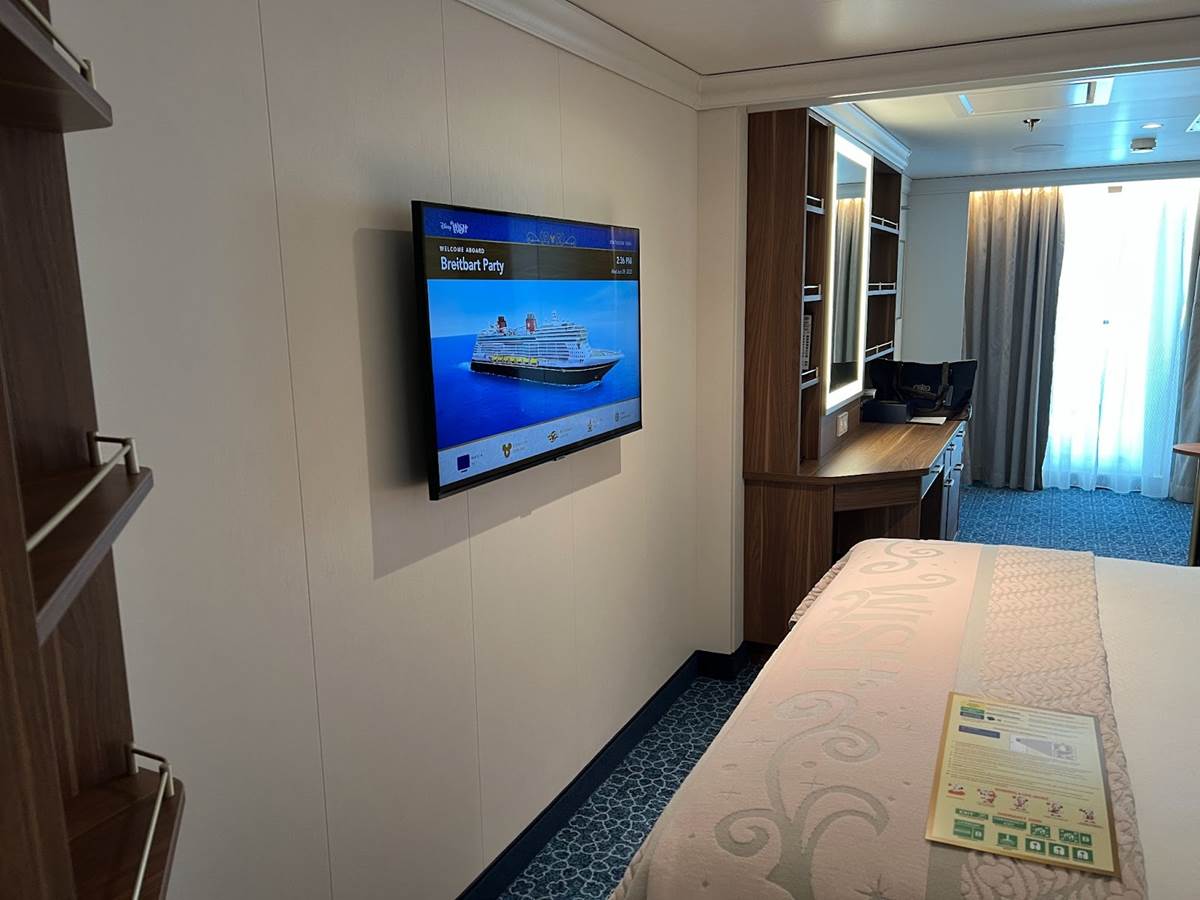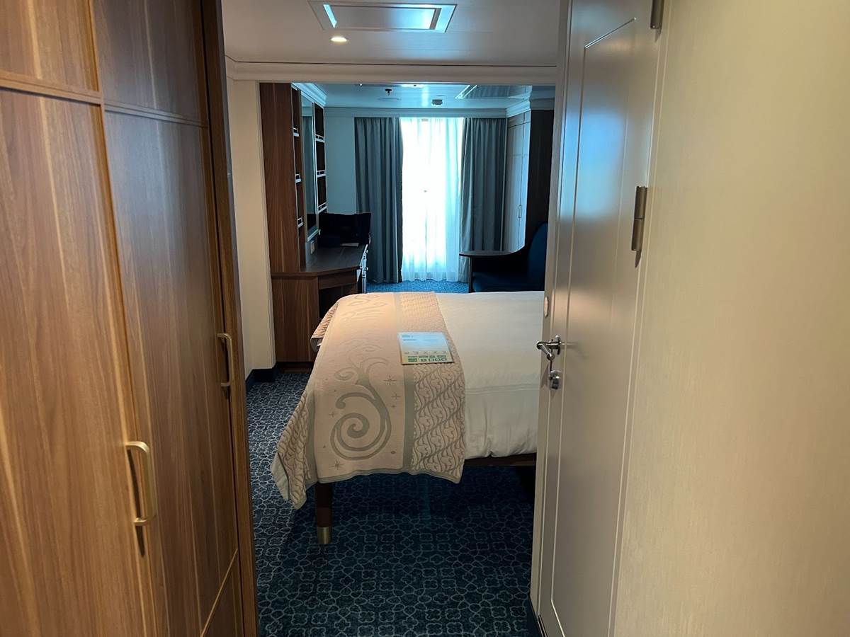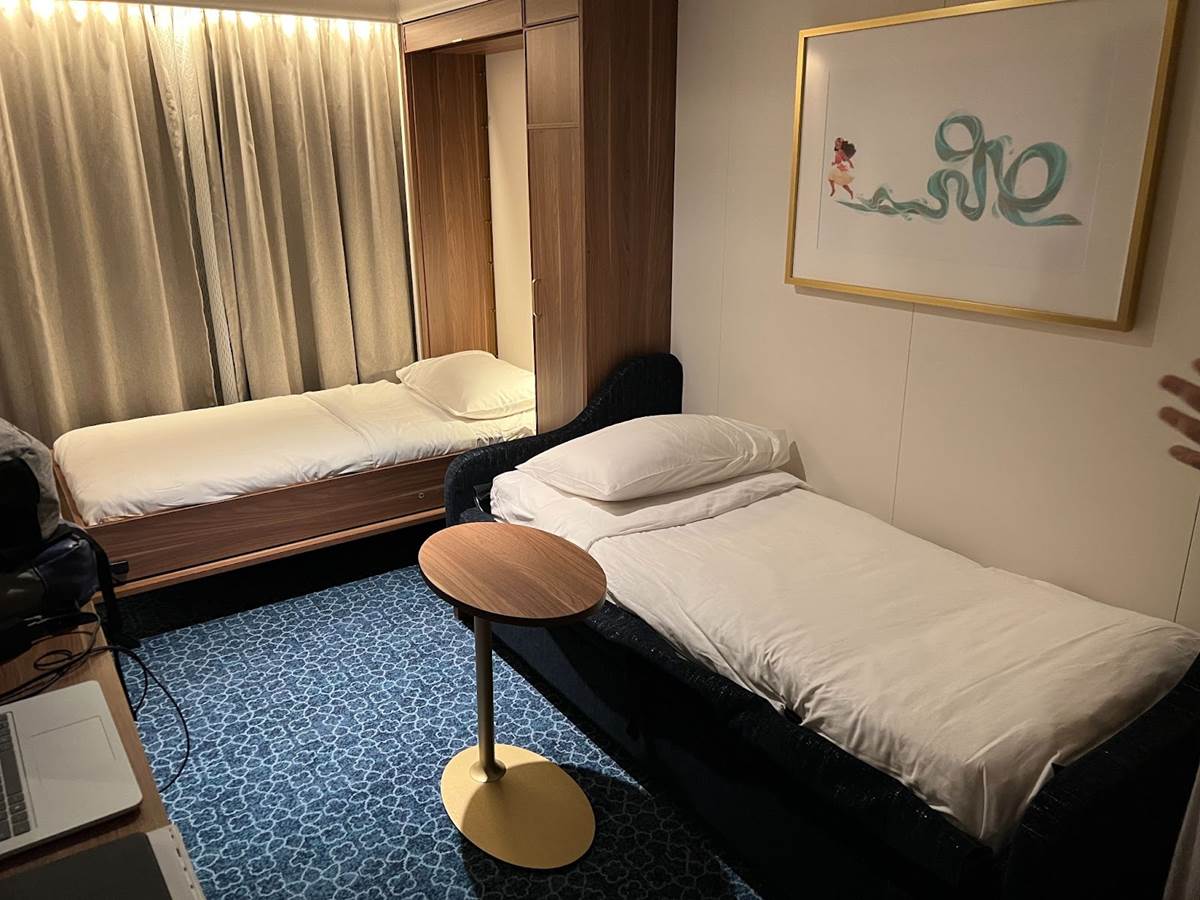 Proceeding into the bedroom, the queen bed takes up the majority of the space, with a TV mounted on the opposite wall. While modifications are always being made, during our cruise, the TV did not include the ability to change the angle, making it somewhat hard to watch from the couch area. When the privacy curtain is closed, guests using the single convertible sofa, upper-berth single pull-down bed, and/or single wall pull-down bed won’t be able to see it.