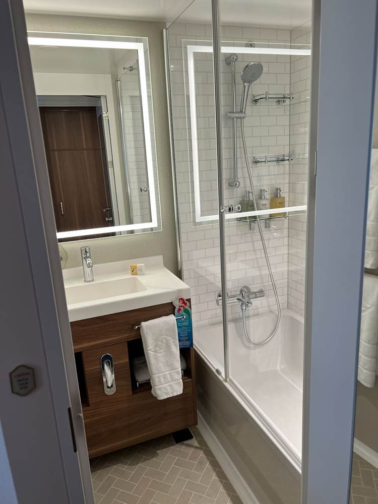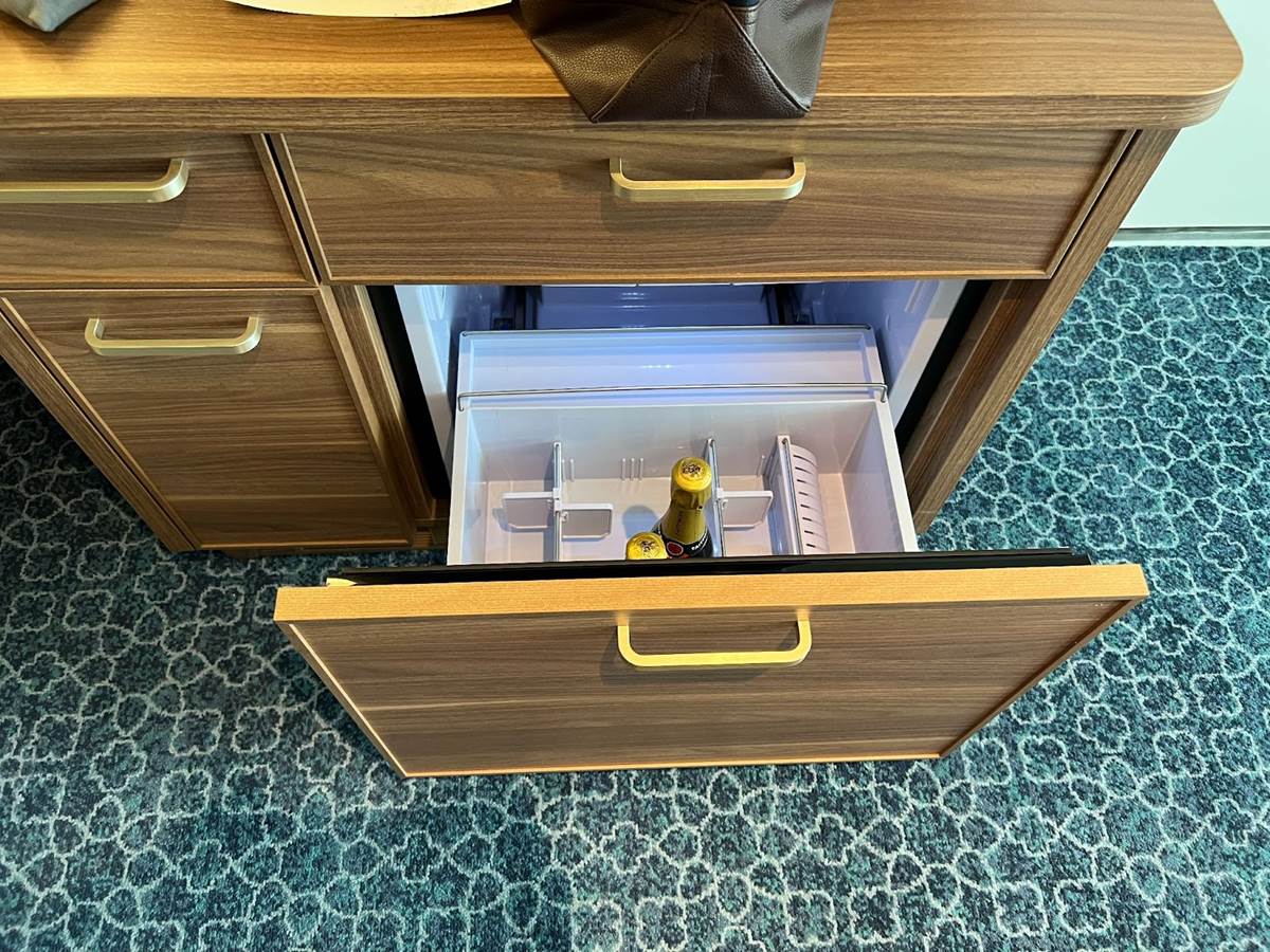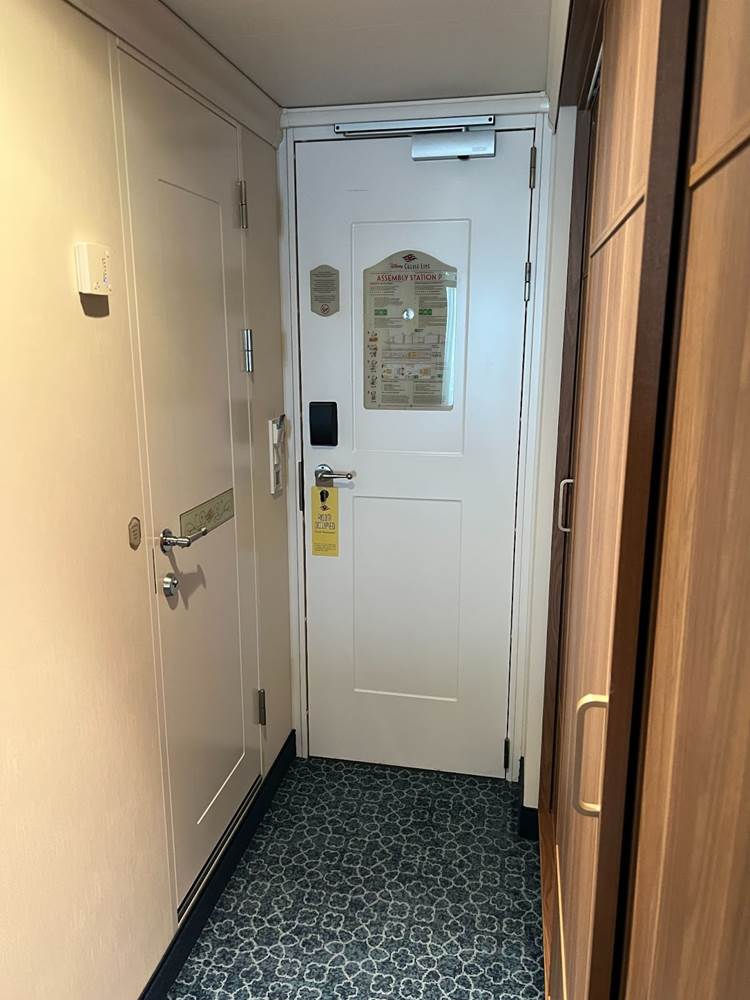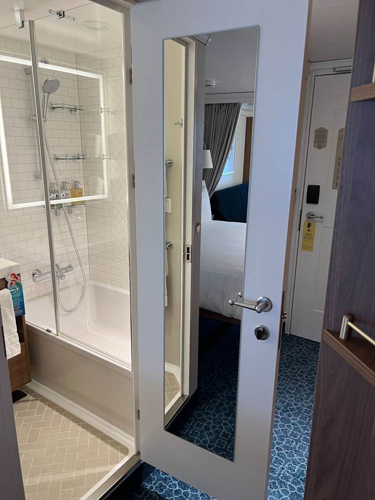Proceeding into the bedroom, the queen bed takes up the majority of the space, with a TV mounted on the opposite wall. While modifications are always being made, during our cruise, the TV did not include the ability to change the angle, making it somewhat hard to watch from the couch area. When the privacy curtain is closed, guests using the single convertible sofa, upper-berth single pull-down bed, and/or single wall pull-down bed won’t be able to see it.