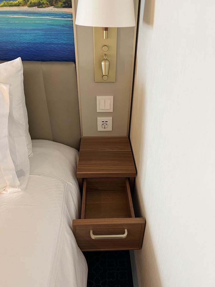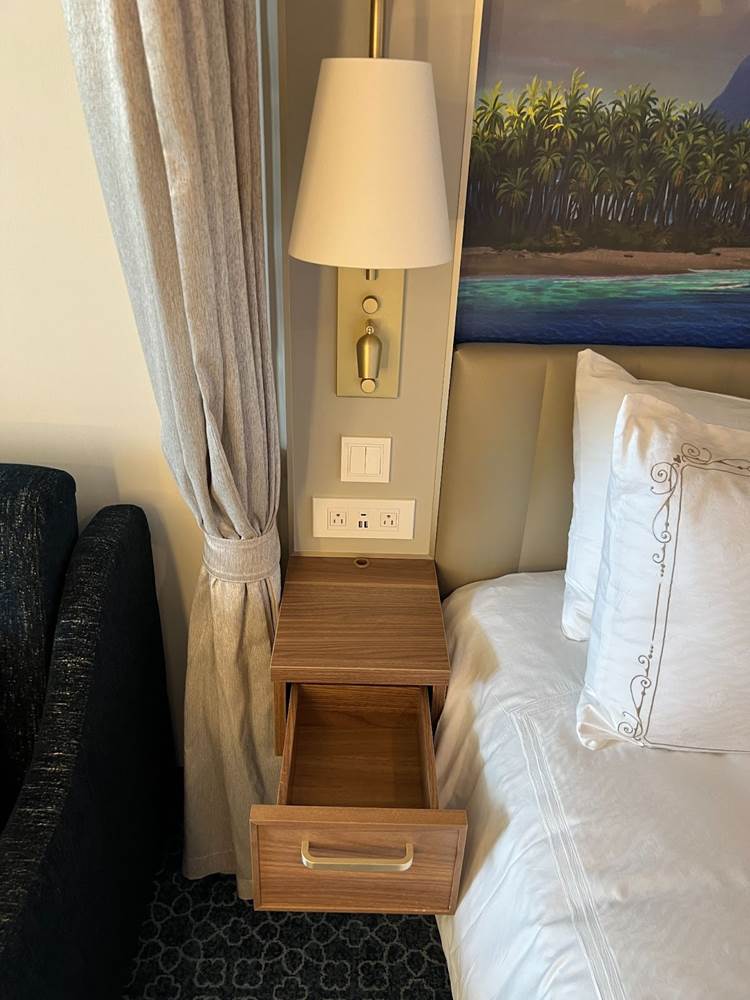 Both sides of the queen bed feature individually controlled lamps and reading lights, electric outlets, and a small drawer. The right side features two USA plugs, two USB ports, and one USB-C port.