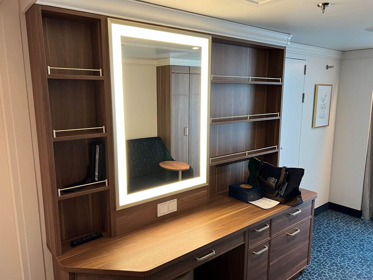 Across from the bed is a vanity area with a light-up mirror and more wall outlets. There’s a slide-out stool and more storage space above and below, including a hair dryer in one of the drawers.
