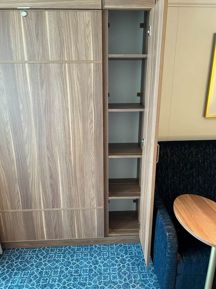 Across from the door is another cabinet that features a little more storage space in addition to the pull-down bed.