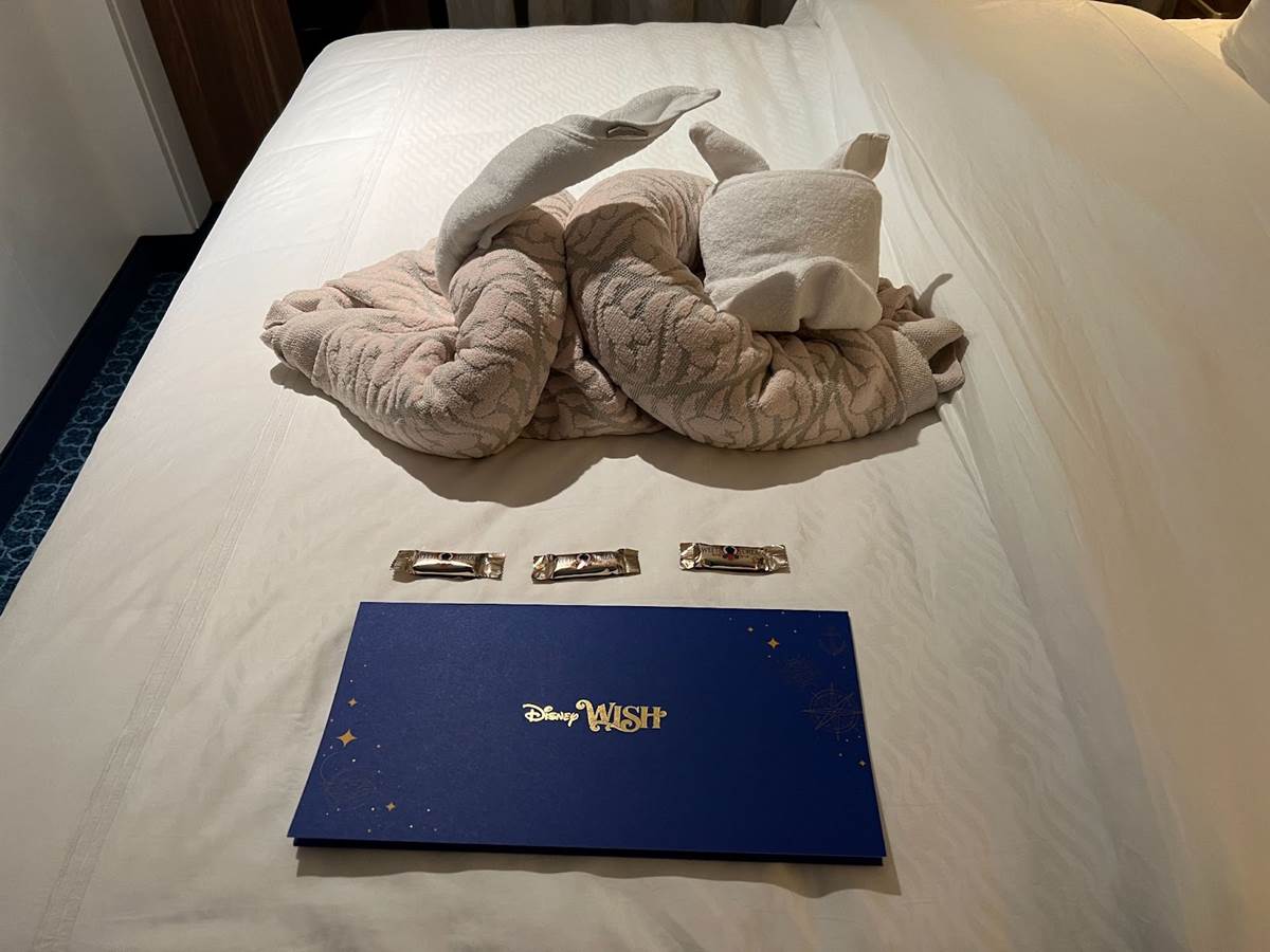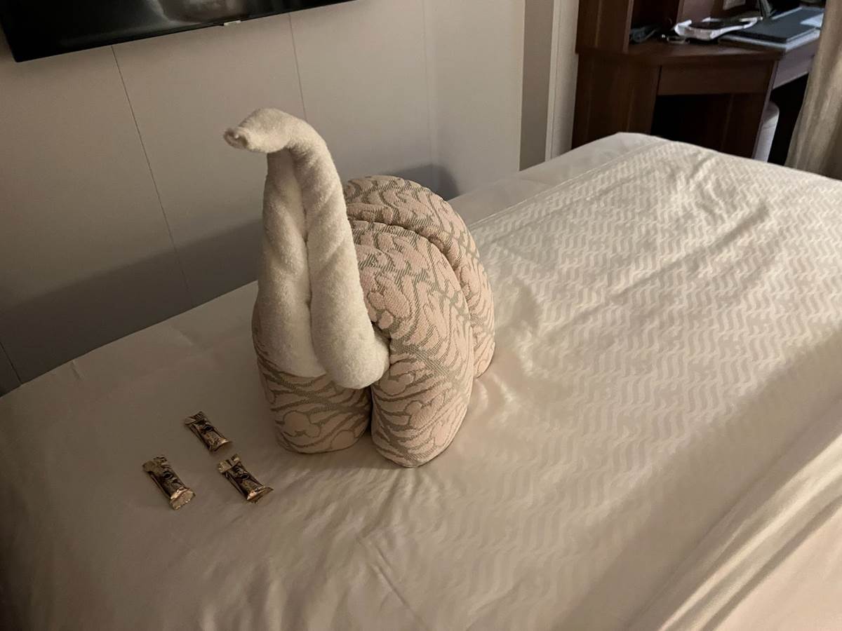 The bed scarf gets used to create enchanting towel animals nightly, accompanied by a Dove chocolate for each guest in the room. This was either an elephant or a brontosaurus.