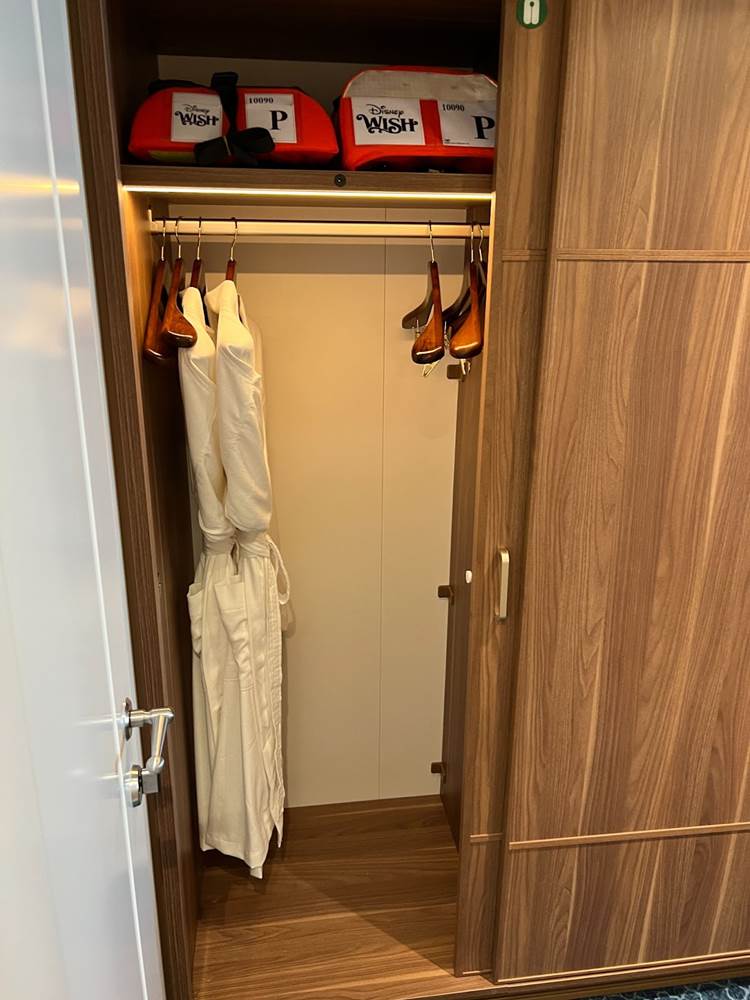 Two bath robes are included in the closet, which is divided into three compartments. Two of these are for hanging items.