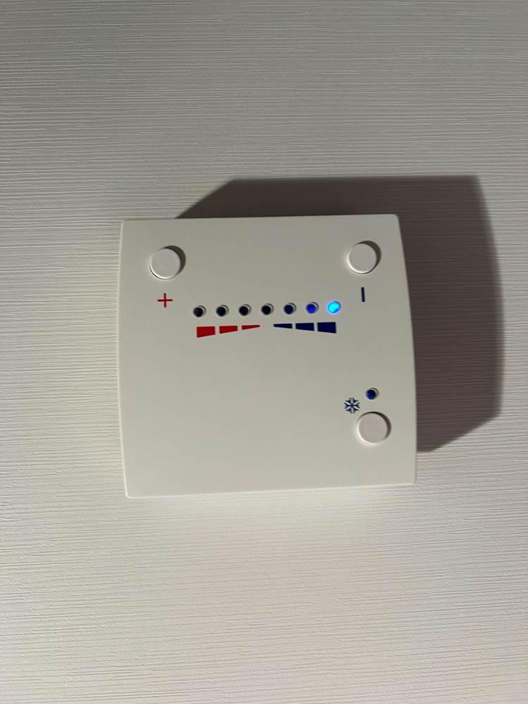You’ll also find the thermostat for the room in the entry hall, which uses a pretty simple hotter/colder system that avoids specific temperature settings.