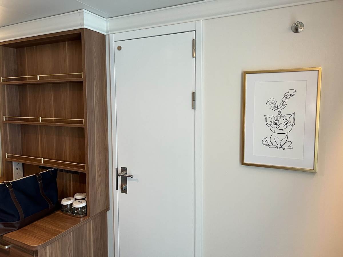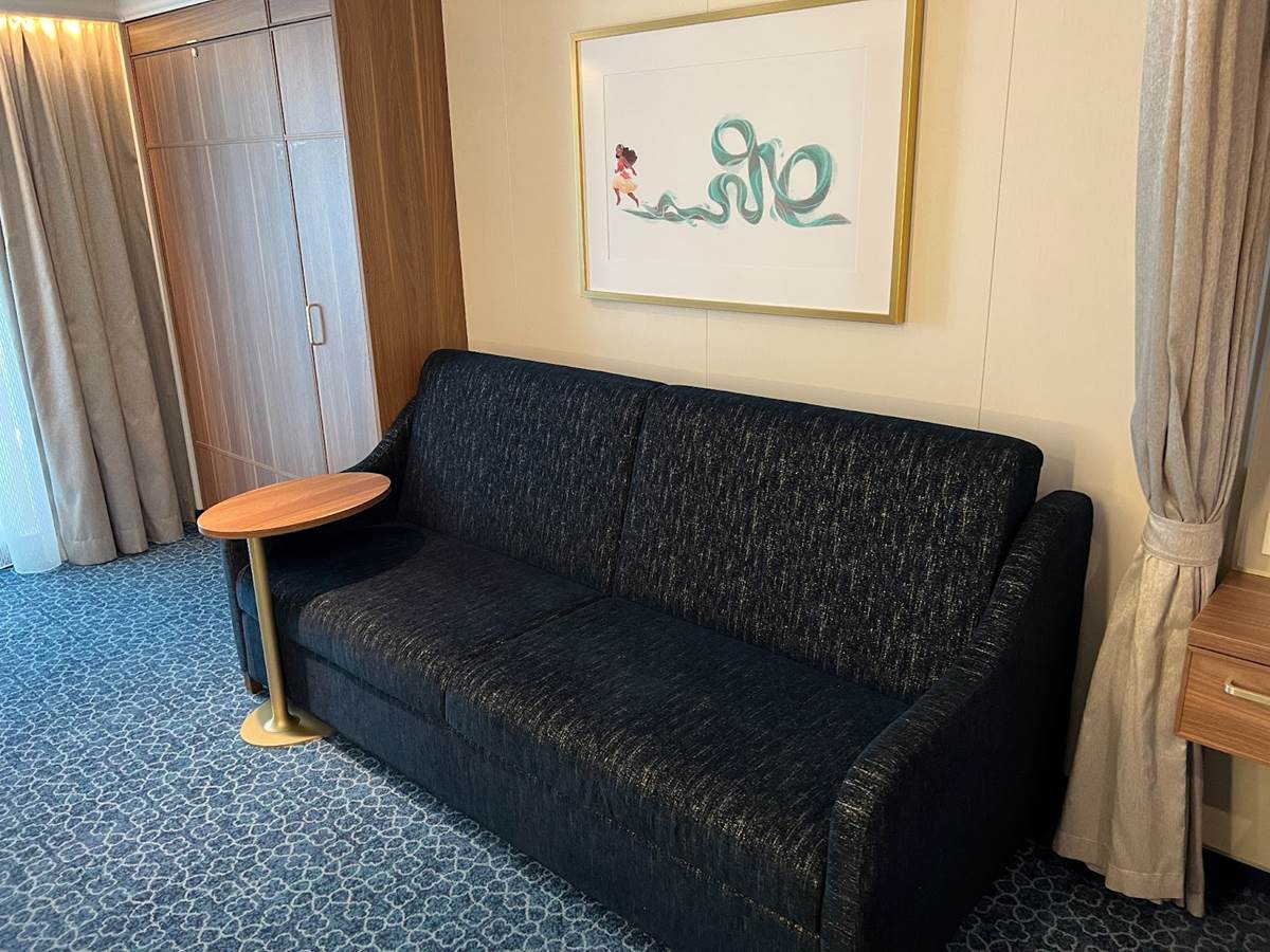 Moving into the sitting area, the couch includes a moveable trey table and more Moana artwork. This converts into a single bed and above it is an upper-berth single pull-down bed for kids. Our stateroom attendant never pulled it down, but Disney’s website says it has “a celestial scene featuring original artwork and an enchanting message from the Fairy Godmother" on the ceiling.