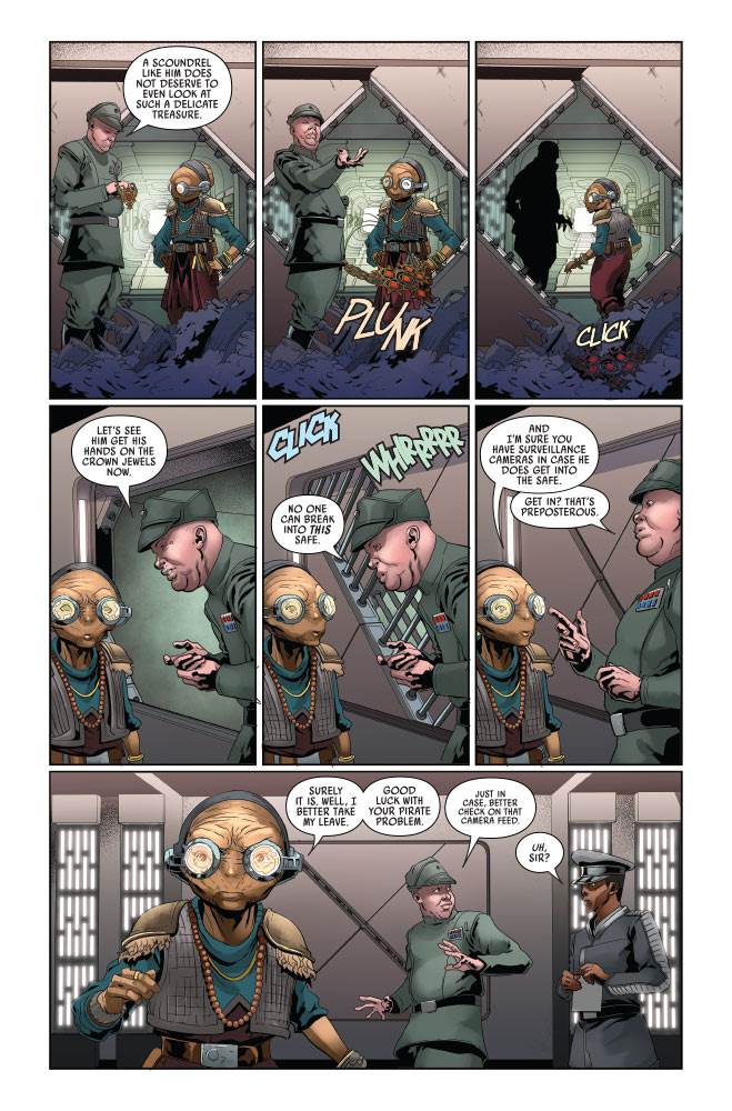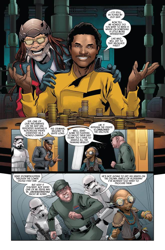 To calm down the young girl named Cimina while her grandfather Shorr Komrrin attempts to distract the pirates, the guest relations droid D3-O9 tells her another story– this one set just after the destruction of Alderaan by the Death Star (as seen in Star Wars: Episode IV - A New Hope). The Galactic Empire has commandeered the Halcyon, and its supervisor General Kardan is using his position of power to acquire spoils of war– antiques and collectibles from across the galaxy. Enter pirate queen Maz Kanata who claims to have come into possession of Alderaan’s crown jewels, now priceless in the wake of the planet’s demolition. Kardan purchases the gleaming necklace from Maz, but little does he know that the centuries-old being is only using this transaction as part of a heist planned with scoundrel Lando Calrissian and that old Weequay pirate– sorry, “legitimate businessman"– Hondo Ohnaka.