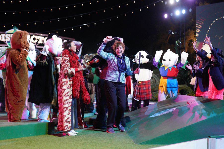 The pair moves on to the final hole, The Distractor, for $250,000. The hole is supposed to feature a huge show stopping number with Miss Piggy but she doesn’t seem to be anywhere. Turns out, she’s locked in her dressing room. Looks like sideline reporter Jeannie Mai will have to step in and take over distracting duties alongside the crazy cast of fur suit characters from the series, along with dancers and the like for what may be the hardest hole in one they’ve ever pulled off. Unlike the usual Distractor, this putt is 25 feet long, has a turn, and the distraction of this showcase is not hidden behind a rotating wall.