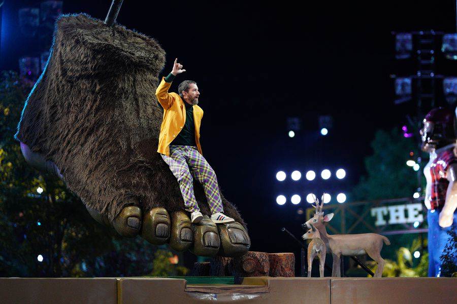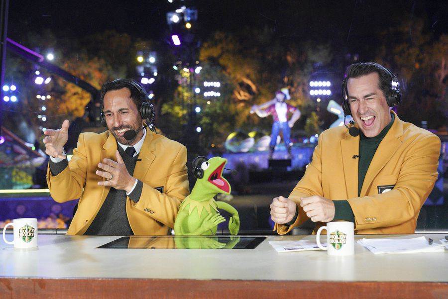 Now, three of those golfers approach the first hole of the finale, each wearing their winner’s plaid jacket. The first hole we see tonight? Full Mooney, appropriate since this was the debut season of this challenge. Kermit is sitting in the booth with Rob and Joe, more out of necessity than want it seems. The challengers, Dylan who owns the miniature golf course, and made his way successfully across Donut Hole, Erika AKA “Birdie" who had that phenomenal drop in win, and “Slip" Rick, who might be more known for his annoying catchphrase “Can you feel the urge?" and his comical slipping on each obstacle more than his actual golfing abilities. Each of these players (and throughout the rest of the finale) are accompanied by their own clip package to remind us of who they are.
