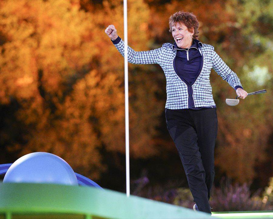 Dylan takes his putt, and has to get around Jeannie and her feather boa, and the earworm of the song she is singing that is also begging ABC to renew the show. The putts between Dylan and Kathy keep alternating as they keep trying to find their lines into the hole while Jeannie and the characters keep dancing. This part of the course has become a party with two people putting right through the middle of it, all while the giant screen behind them asks ABC to “Pick us up."