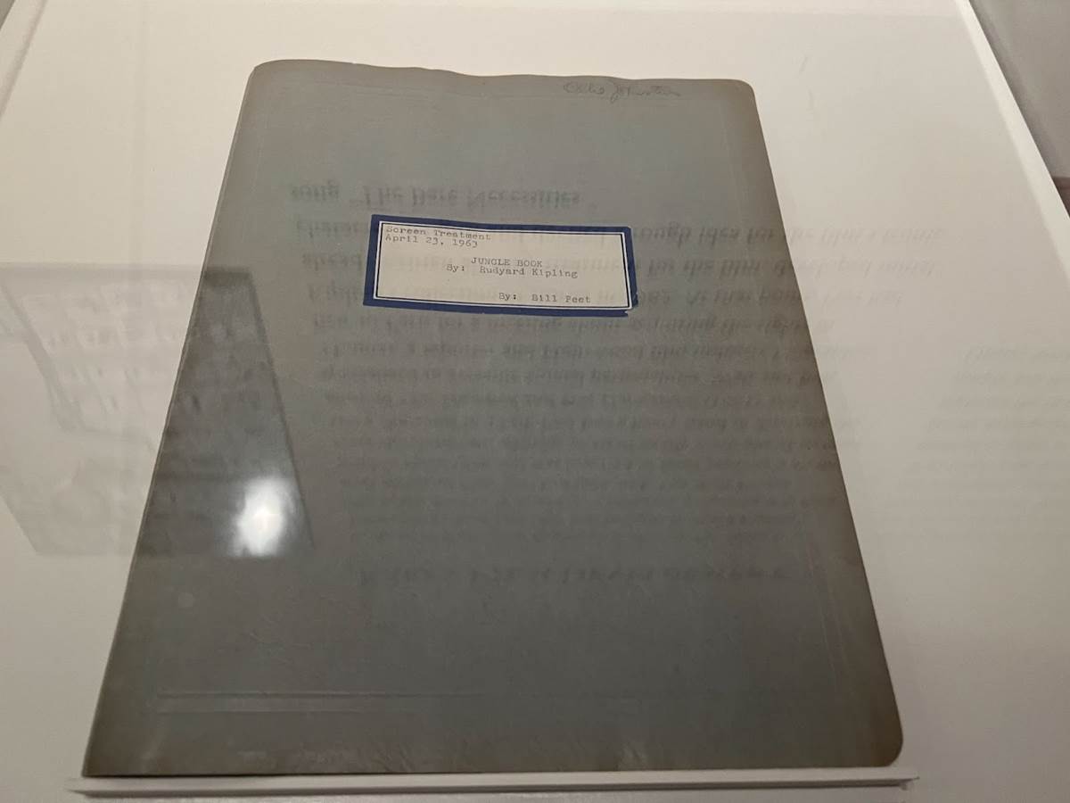 One of the most intriguing items on display isn’t a piece of art in the traditional sense, but a bound draft of Bill Peet’s script and story sketches. Bill Peet was a longtime writer at Disney and had great success as the sole writer on 101 Dalmatians, but his follow-up effort, The Sword in the Stone, was a commercial flop. When Walt Disney took a look at his adaptation of The Jungle Book, he deemed it too dark. A touch-screen experience next to this draft allows visitors to explore an unmade version of the film. Bill Peet left the studio over the story changes and budding animator Floyd Norman suddenly found himself working in the story department on the film. Walt’s edict: Don’t read the book.