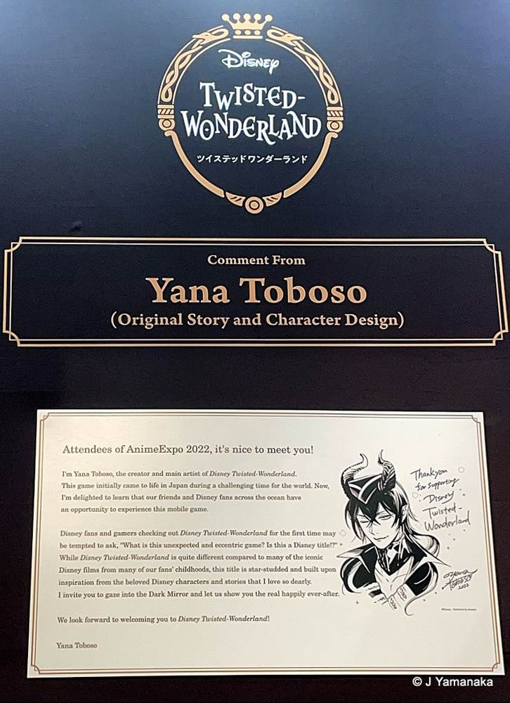 A video greeting from one of Hanae’s fellow voice actors, Nobunaga Shimazaki, (Silver from Diasomnia dorm) was presented, as well as a message and special artwork created for the panel by character designer and concept creator Yana Toboso. A replica of the letter was later posted at the Twisted-Wonderland booth in the Entertainment Hall.
