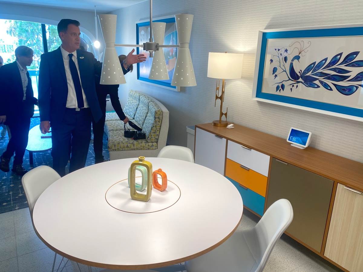 The suite implies the mid-century modern design sensibilities of the Monsanto house (a melding of functional style and cutting-edge technology). Other décor/design inspirations came from examples of Googie and mid-century modern architecture once found in the Anaheim Resort District during the 1960s.
