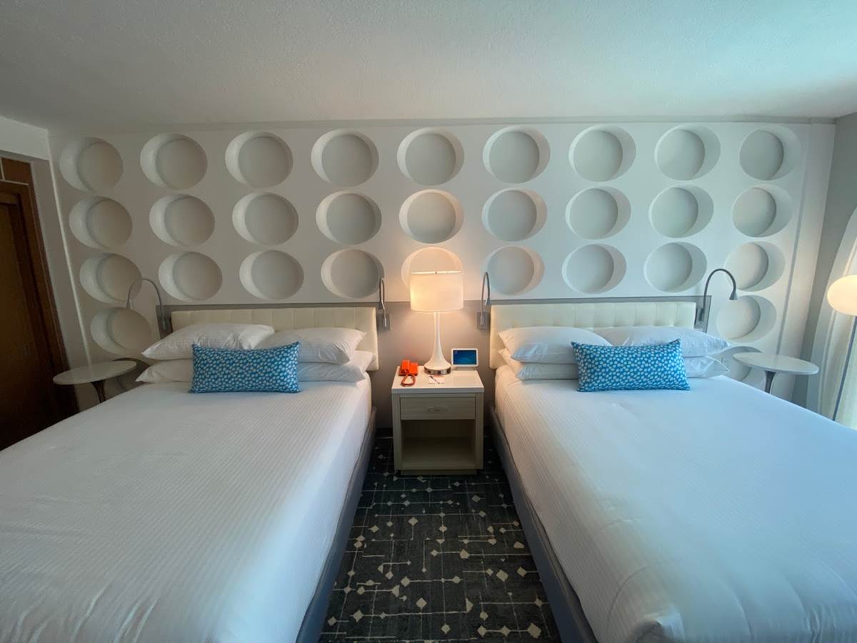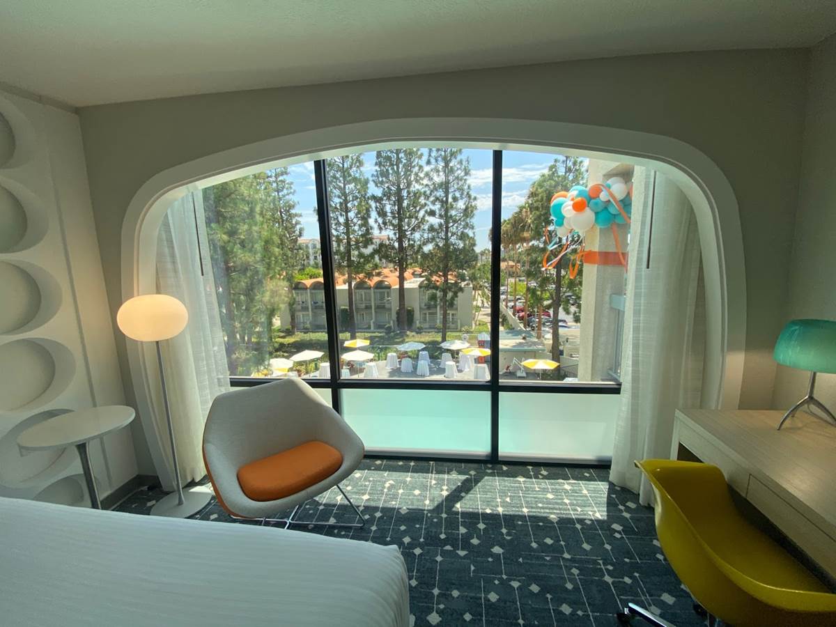 The suite features numerous design nuances that harken back to the Monsanto House of the Future, such as multi-paned window frames (providing glimpses of the futuristic Disneyland Monorail), a seemingly 1960s era tube TV with round/curved framing, and vibrant color schemes.